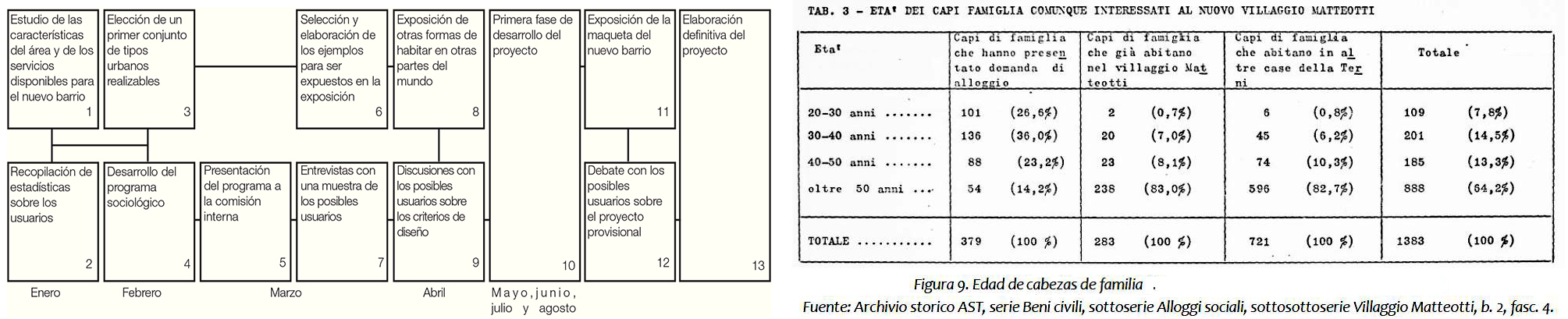A pesar de esto, en mayo, la asignación de viviendas se realizó y fue dirigida a tres grupos de personas: la primera, a personas que al menos desde hace un año vivían en una casa de la empresa, la segunda, a perso- nas que al menos desde hace un año vivían en una casa social y, la tercera, a personas que no vivían en viviendas sociales. Todas las personas estaban evaluadas con diferentes criterios a los que se les asignó una puntua- ción y en casos de una puntuación igual, la preferencia sería para los trabajadores con más años de servicio. En agosto de 1973 se publicaron los rankings y en setiembre salió el segundo número del órgano de vivienda de Terni dedicado a Matteotti, el número 17. En este número, según los documentos con- servados, se presentó por primera vez el plan general de toda la zona, las fotos de la ma- queta referida al área construida y una de las cinco unidades diseñadas, la Unidad 1. Esta unidad se utilizó para explicar la posibilidad de elección de los usuarios dentro de los rangos de las variantes.