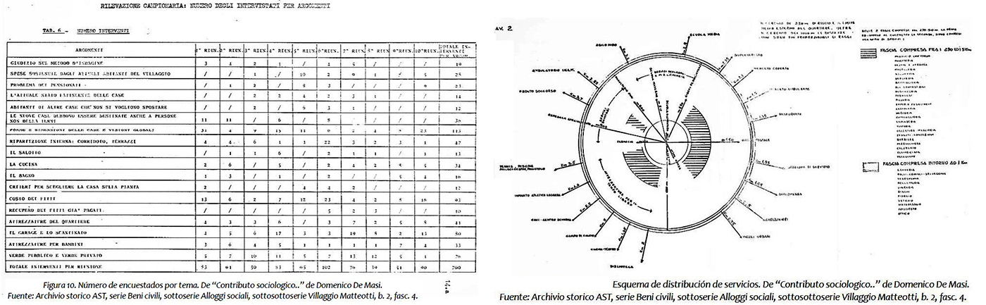 Para mayor variedad de uso en los espacios, se realizaron estadísticas que desvelasen la composición de las familias, disponiéndolas en organizaciones internas flexibles, según las cuales podía variar la tipología de viviendas; todo ello se dejó escrito en la “Definición aproximada de algunas metas que se desearía alcanzar en el diseño” (3 de febrero de 1970). Sin embargo, todavía no estaban claros los parámetros concretos, no era possible asignar viviendas sin proyecto. El sociólogo Domenico De Masi interpretó las necesidades de De Carlo y medió con los usuarios futuros, operando en seis fases, descritas en la “Contribución sociológica al diseño del nuevo villaggio Matteotti de S.p.A Terni”.