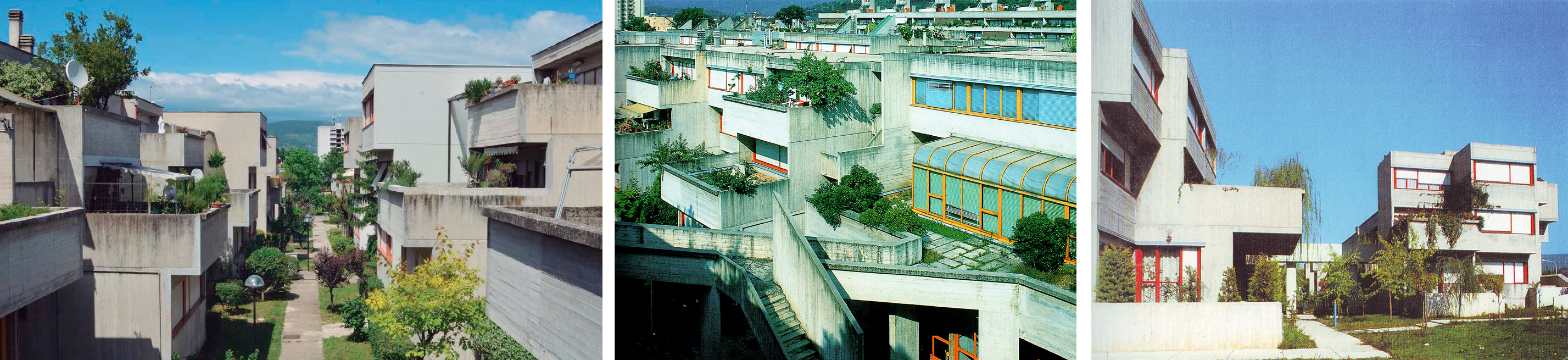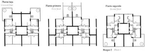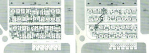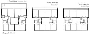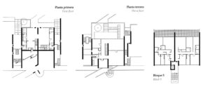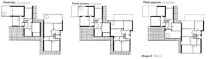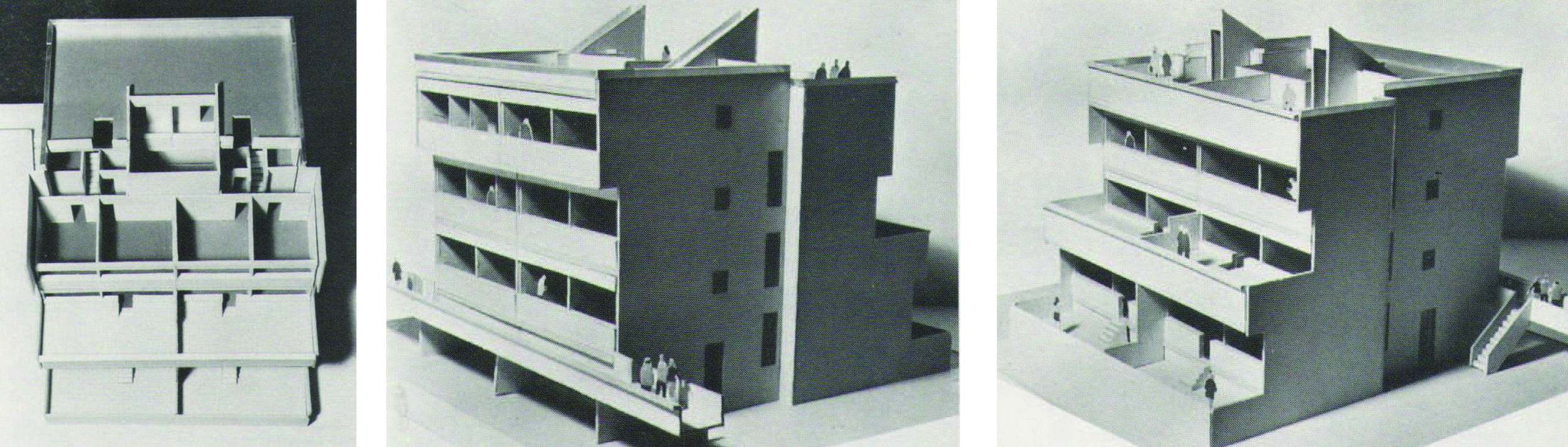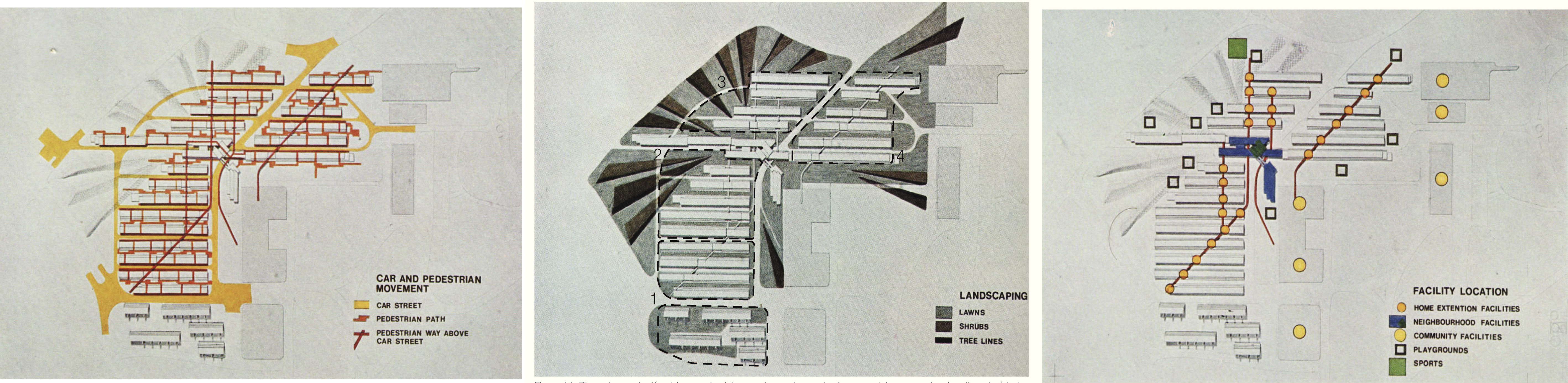 En las tres primeras había tipologías ya adoptadas por la compañía, (slab housing y torres) y, las últimas dos, eran esquemas de pocas plantas y alta densidad, similares a lo que se ha dado en llamar mat-housing, con una “organización de los espacios en correspondencia con un modo de vida que beneficia los intercambios de la comunidad”.