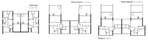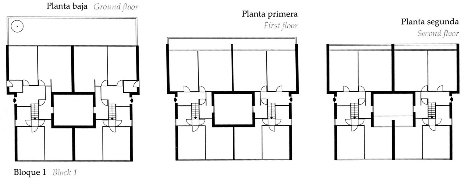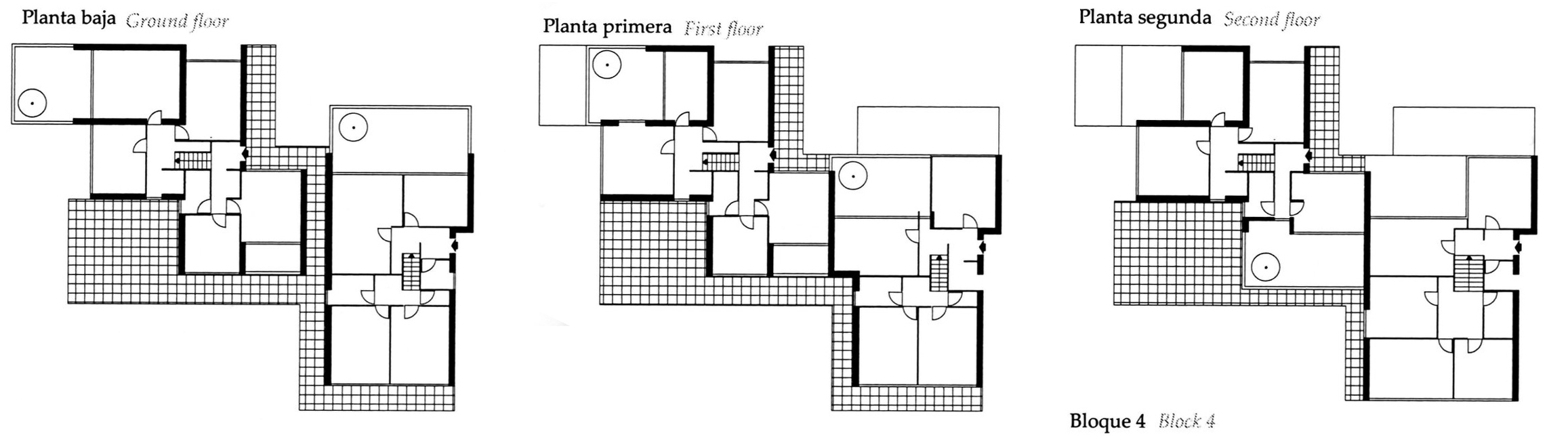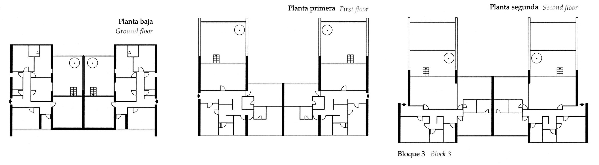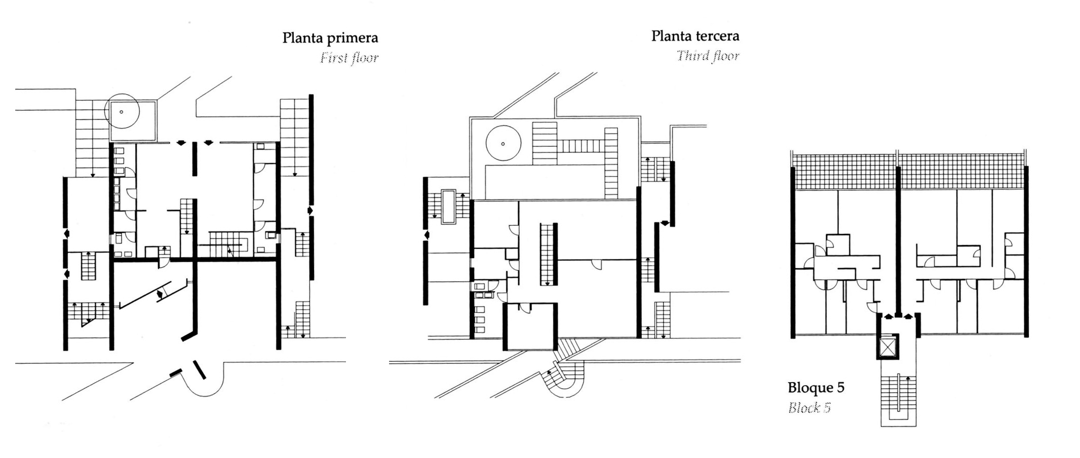 En las tres primeras había tipologías ya adoptadas por la compañía, (slab housing y torres) y, las últimas dos, eran esquemas de pocas plantas y alta densidad, similares a lo que se ha dado en llamar mat-housing, con una “organización de los espacios en correspondencia con un modo de vida que beneficia los intercambios de la comunidad”.