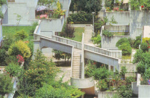 Se implantaron así formas complejas, articulando jardines, terrazas y viviendas. En su centro, se previeron tiendas y espacios comunes, accesibles desde superficies inclinadas que enlazan las terrazas con los aparcamientos cercanos.