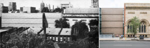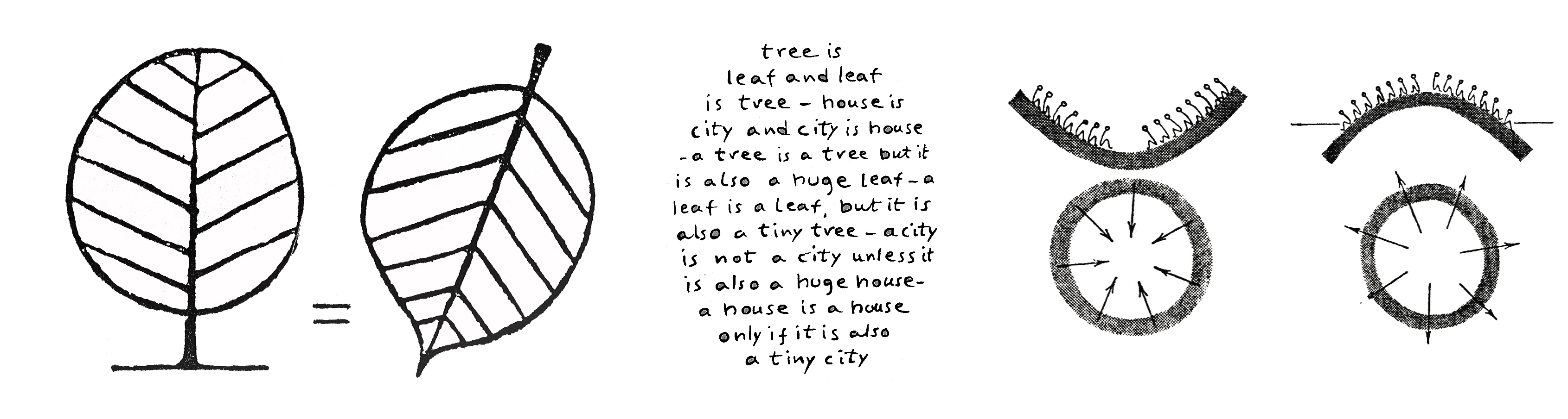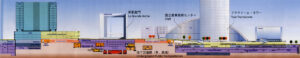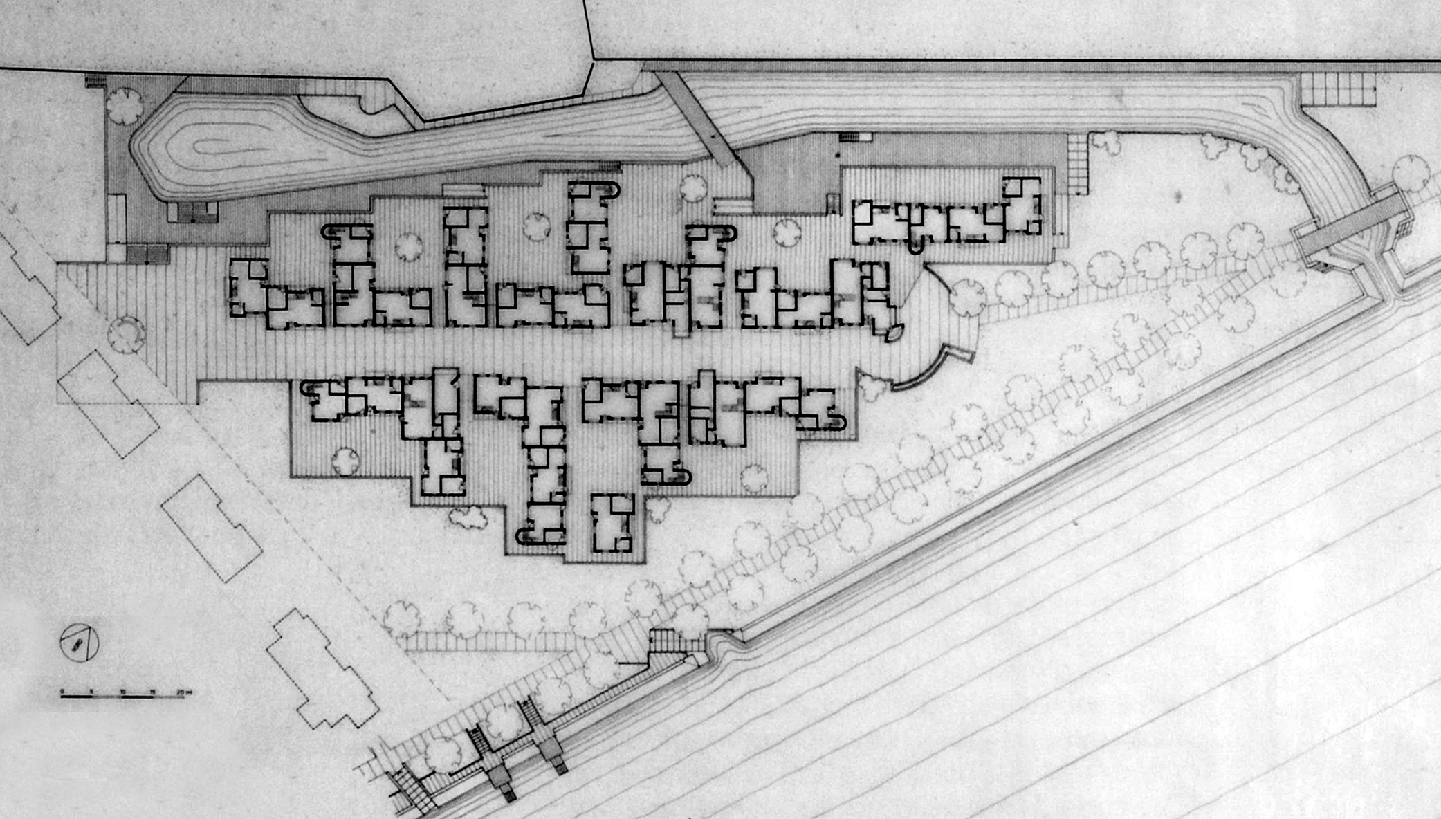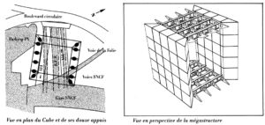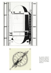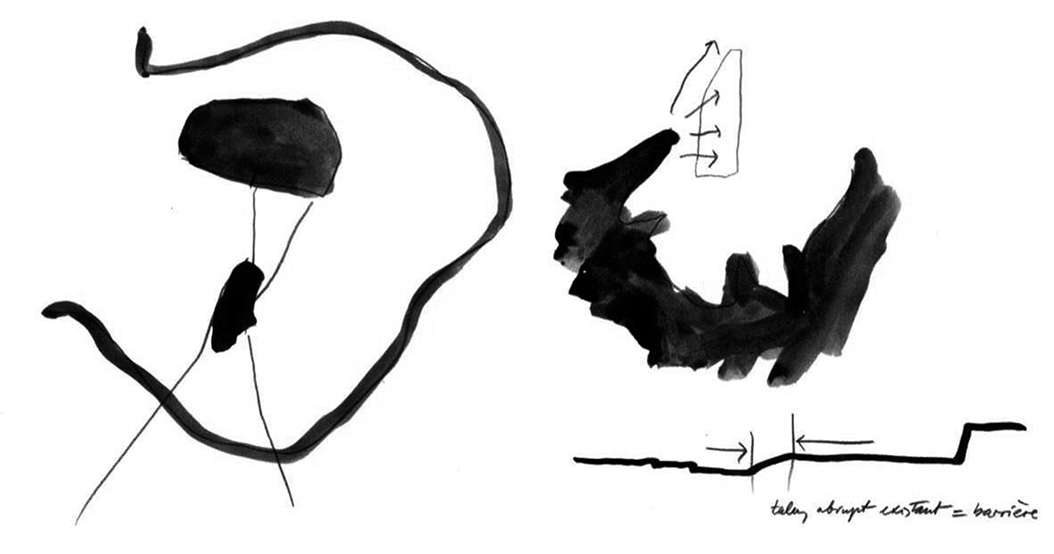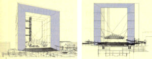 – la percepción del tejido de V. Bligny se deja ver ya en los primeros dibujos: para recuperar la actividad en la periferia de una gran ciudad, una arquitectura rotunda, con referentes de la mejor arquitectura moderna,