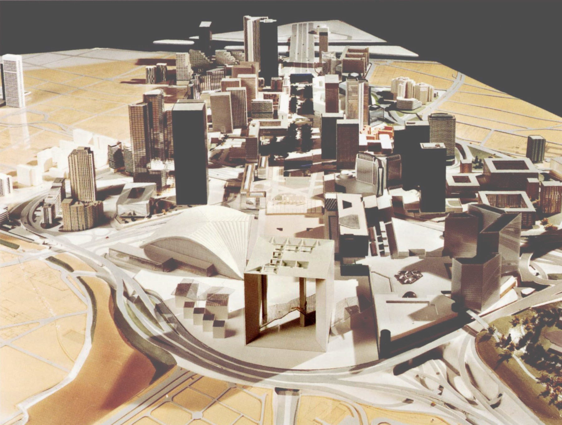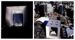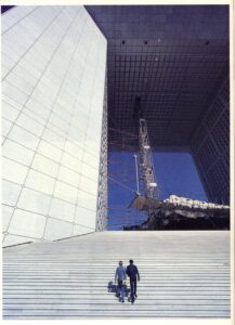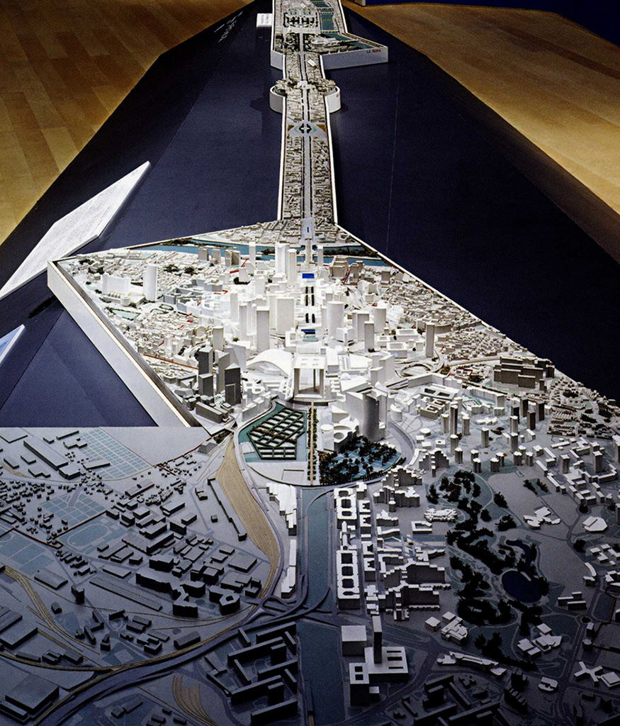 Visto desde la terraza de Saint-Germain, París siempre ha sido una amalgama confusa. Hace treinta años, la aparición del gran velo de hormigón que cubría el Centro de Exposiciones fue una especie de hito, aunque la casualidad de la perspectiva lo convirtió en el fundamento incongruente del único monumento visible desde esa distancia: el Sagrado Corazón. Aireado y dibujado, el extremadamente claro contorno del Arco constituye hoy en día un hito mucho más evidente – como una certeza, en el espacio distendido de la periferia. Cuanto más nos acercamos a ella, más perceptible es el poder de esta masa, transformando la imagen que se podría tener de Nanterre, sus chatarreros y chabolas como uno de los lugares más desfavorecidos de los suburbios interiores. El monumento jugó realmente el papel estructurador que se esperaba de él: hizo de su fondo el comienzo de otra cosa, una invitación a la ciudad.