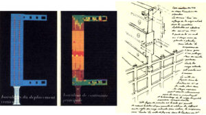 Cuando se hizo otro ejercicio para entender cómo se hicieron los muros, hubo otro descubrimiento. Fue que hay correspondencias. En este caso, si se rastrean las correspondencias, una sobre otra, etc. etc., siempre se tiene algo que es lo suficientemente preciso para dar instrucciones sobre qué hacer. Puedes proyectar los espacios internos en la pared para entender cómo se podrían poner los agujeros, no sólo en relación con el espacio interno, sino también en relación con la fachada y con los otros huecos.