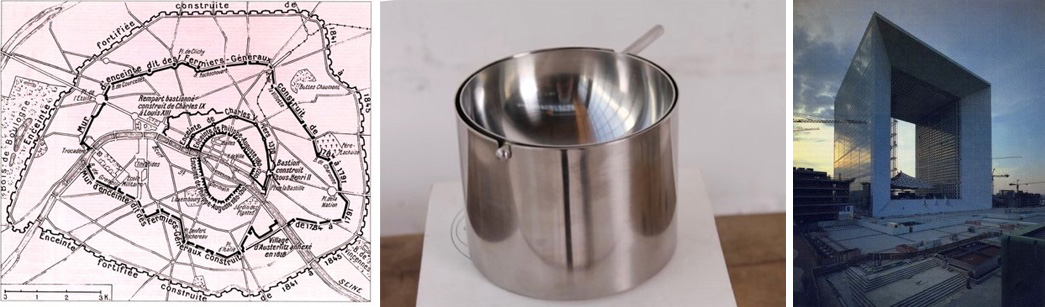 1_a_sucesivas cintas murarias marcan el crecimiento de Paris, y en ellas algunos edificios y monumentos marcan hitos de orientación y control. b_un objeto sencillo como el cenicero de Jacobsen presenta complejidades insólitas._ c un cubo, transformado en arco de triunfo presenta dificultades insólitas cuando aumenta de tamaño.Desorden urbano en la defense. Los croquis de Von Sprecklensen muestran una forma abstracta, todavía reminiscente de una representación axonometrica.