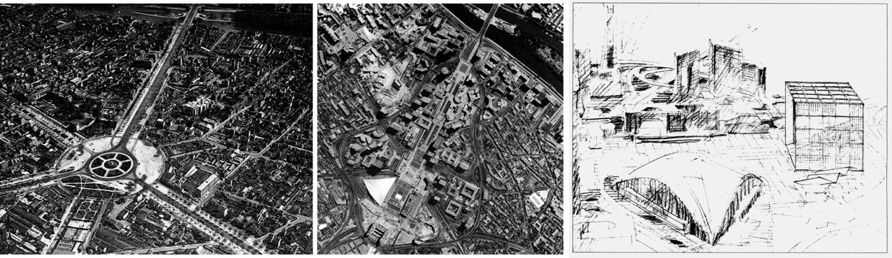 El eje del Louvre y las Tullerías está sufriendo un cambio deliberado en su curso. Cuando se decidió aplazar la concesión de París al exterior de los nuevos barrios bajo Napoleón III, el diseño de la Place de l’Étoile se concibió de manera que se realzaran las perspectivas oblicuas del monumento. Inicialmente, sólo había una avenida en el eje – los Campos Elíseos – que atravesaba un muro de recinto marcado por dos pabellones de concesión. Al darle a la Place de l’Etoile la radiante forma de doce ramas que ahora es suya, Hittorff multiplicó las perspectivas oblicuas, cambiando totalmente la silueta del edificio según el ángulo desde el que se aproxima. Entre los dos ejes perpendiculares se introducen cada vez dos avenidas: el ángulo de 30º da una vista tangente de las caras del edificio (la más bella es la ligeramente en picado, que fue enmarcada desde la avenida Foch y es la verdadera extensión de la perspectiva hacia el Bois de Boulogne). A Spreckelsen se le encargó la tarea de tomar el eje de las Tullerías y darle, unos kilómetros más adelante, una nueva conclusión. Propuso una versión magistral del principio de tangencia explotado por su predecesor.