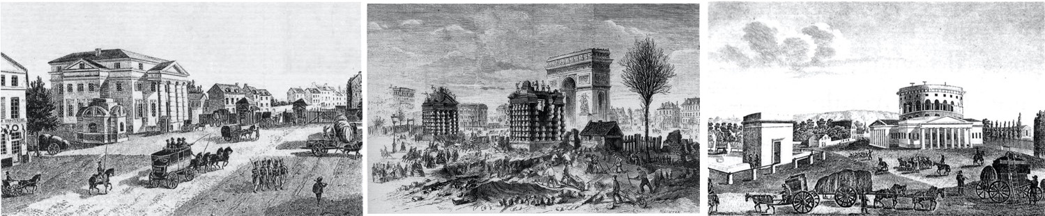 Barrières de Sant-Denis (en 1820), démolition de la B. de l’Etoile, 1860, Barriere de la Villette, 1820.