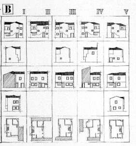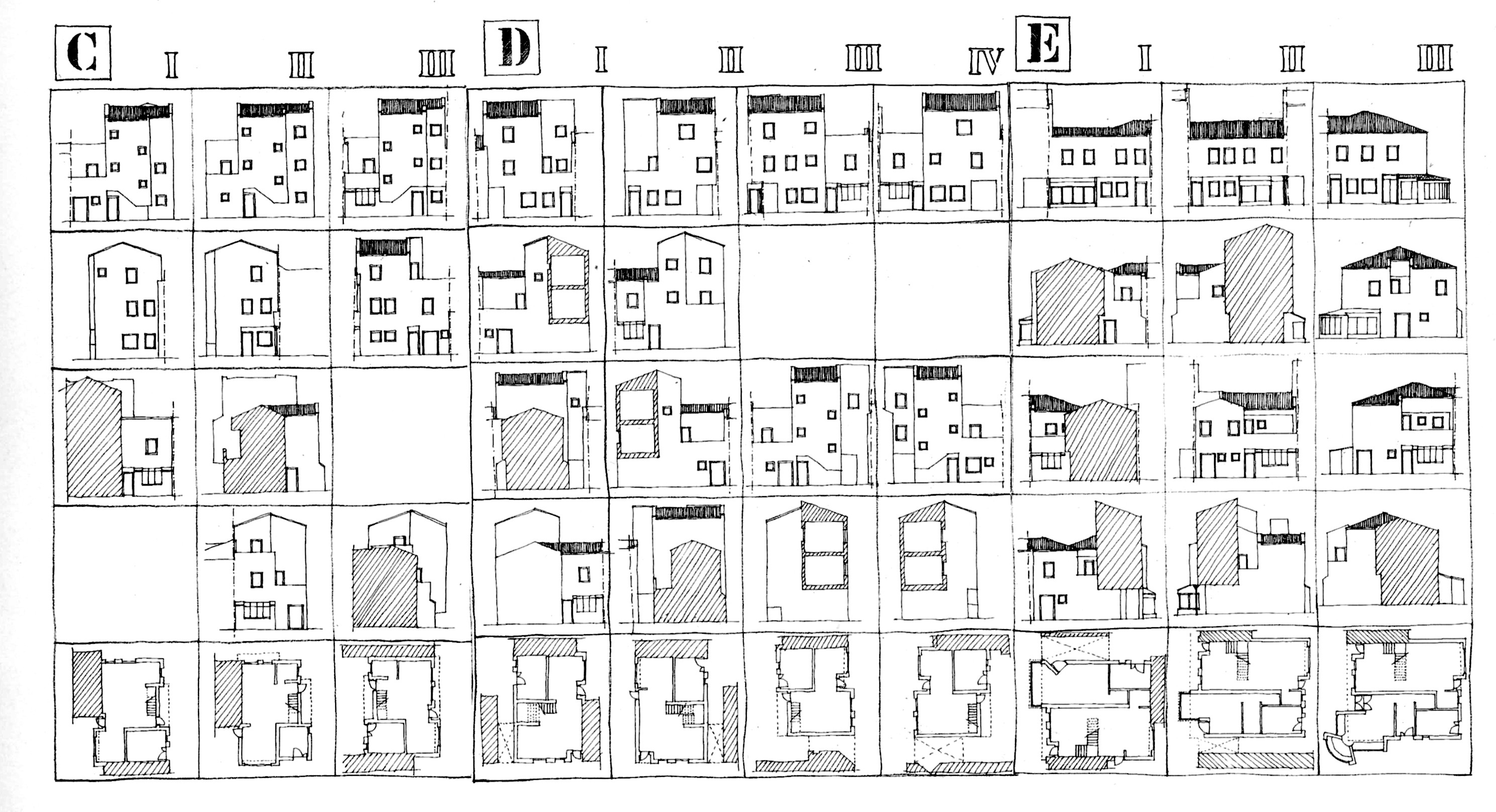 En primer lugar se elaboró una serie de “casas modelo” que dieron origen a 36 viviendas, cuyas formas contiguas respondían menos a las exigencias de los espacios internos (como en Terni) que a su disposición en un plano general (según terrazas o ángulos). Estas formas, aunque evitan la copia pitto resque, siguen un riguroso proceso de desarrollo. Los diversos elementos, articulados como en Terni, han permitido diseñar cajas de escaleras, cilindros, composiciones rítmicas y estratégicas, colores. Para los nuevos residentes, el resultado fue tan convincente como familiar. Pero el proyecto tuvo que ser reducido para acomodar el inevitable estadio de fútbol, y sólo se construyó el gimnasio.