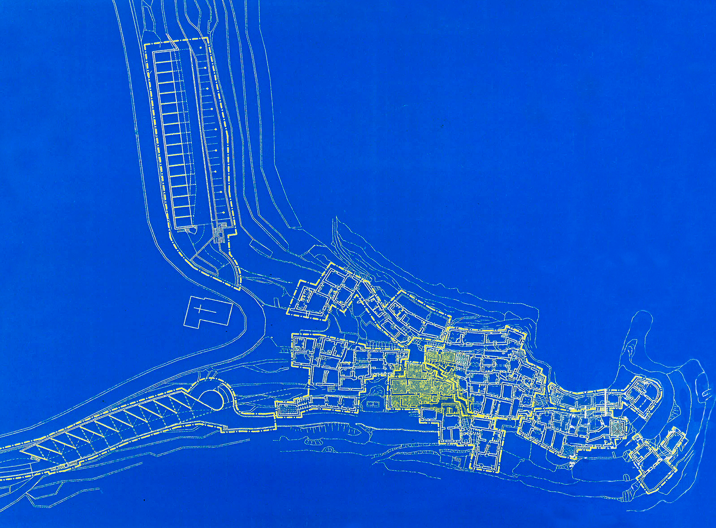 Propuesta de De Carlo. Estacionamiento y parking a la entrada del poblado que queda aislado del trafico. Compárese con la planta de AReview -de fondo azul- donde se señala el núcleo central, más integrado, diferenciado de los flancos.