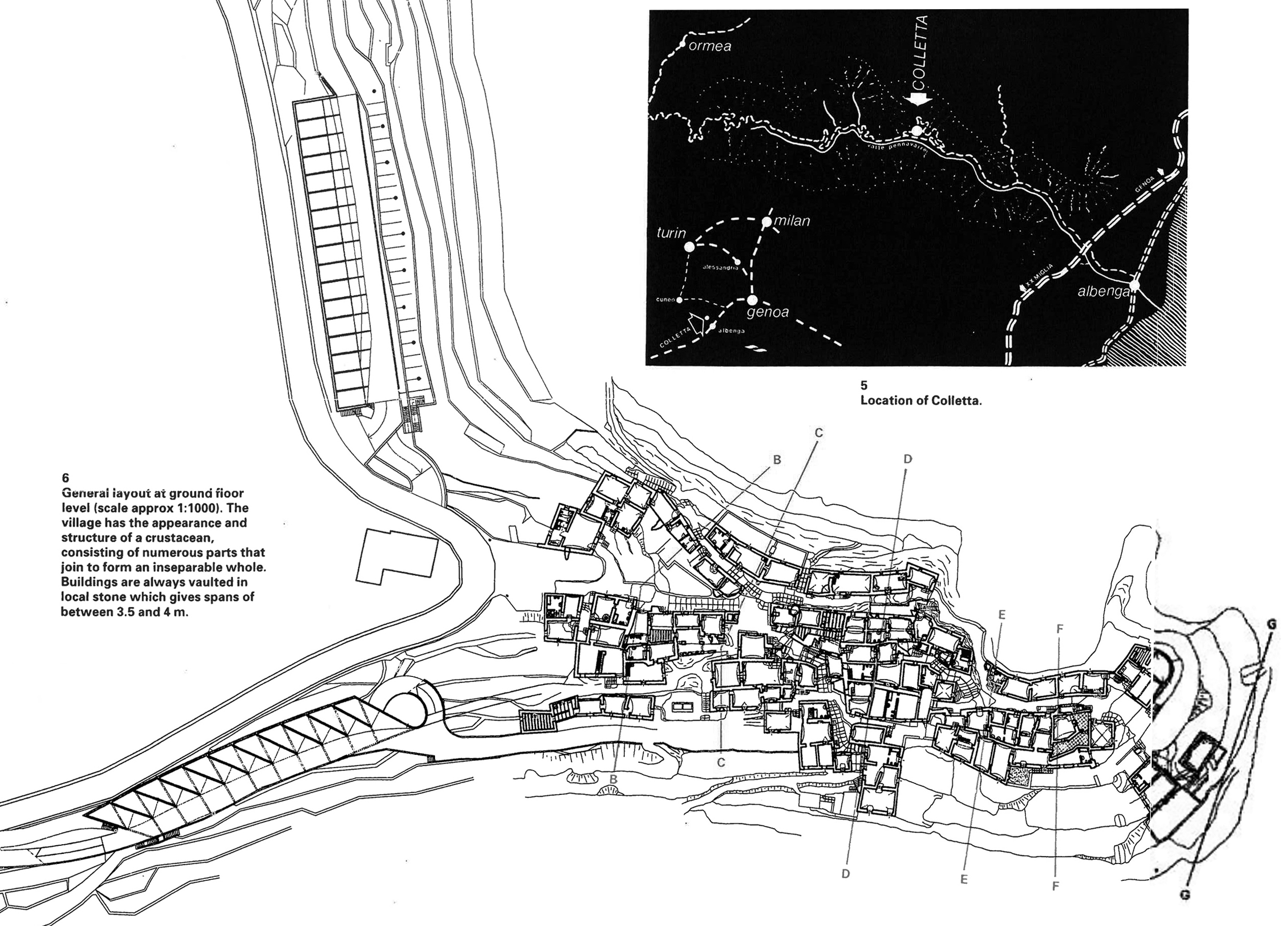 Los ejes de trabajo al analizar la propuesta de De Carlo para Colletta di Castelbianco operan, siguiendo un método testado por él mismo durante lustros, desde: