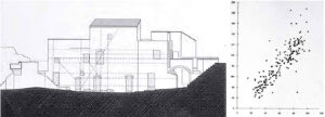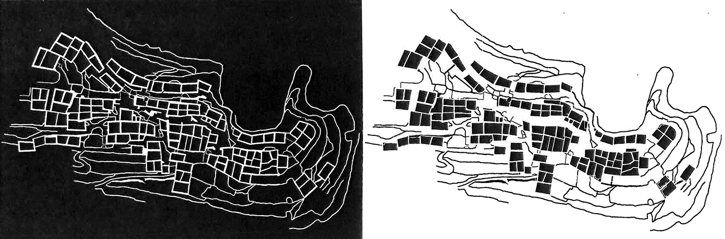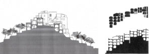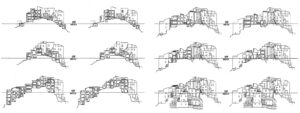 Conciencia de la globalidad: el poblado en ruinas es tratado respetando la idea de conjunto, sus centros, y el modo en que va desparramándose por las laderas. La realización de siete secciones transversales compara el antes y después de la intervención, pudiendo apreciar la pervivencia de su carácter. Se han encajado desde fuentes diversas la planta y las secciones, de modo que se desate la inquietud por ver no sólo las partes del poblado, sino cómo encajan, configurando una totalidad. Esas secciones son nuestro aliado inicial para dominar la espacialidad del conjunto. Nótese que nunca se realizó una sección longitudinal, y recuerdo las palabras del propio De Carlo “o bien operamos respetando la cota o yendo contra cota”. Si estamos definiendo secuencias transversales, nos hallamos en la situación segunda, y la primera se deriva de la superposición de todas secciones.