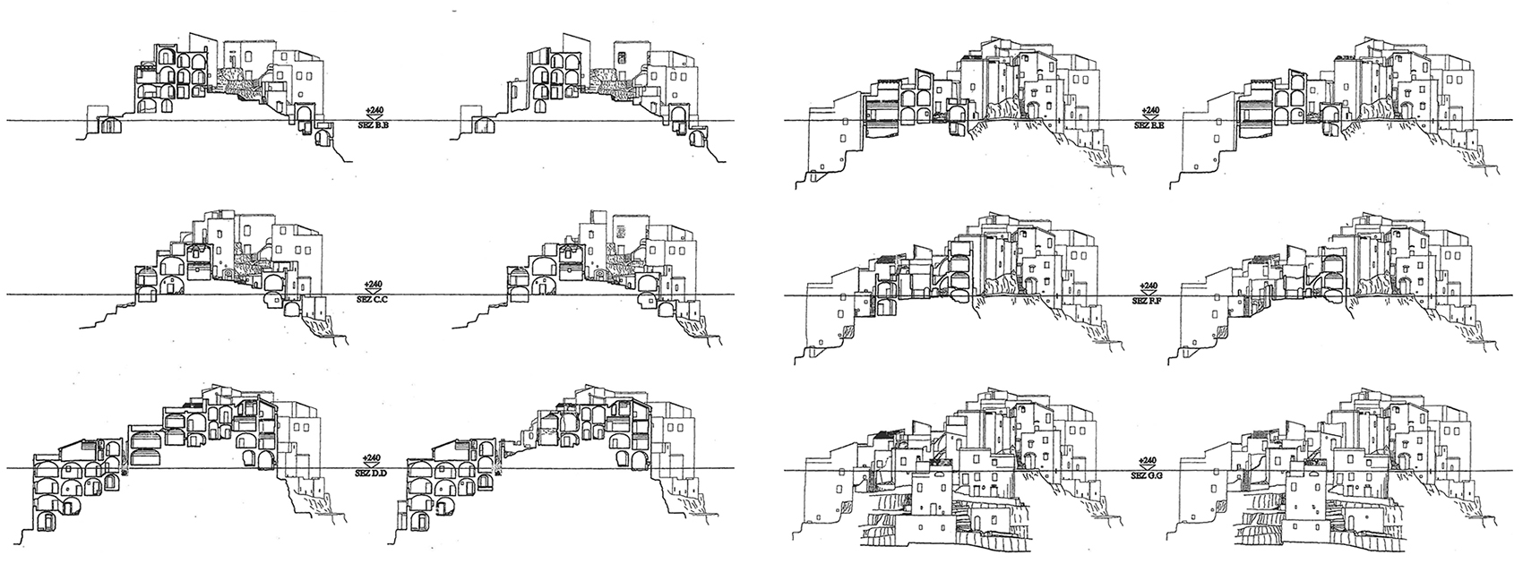 Secciones BB, CCC, DD/ y EE, FF, GG. Las primeras correspondientes al Sector occidental del poblado, las últimas correspondientes al Sector Oriental. En cada caso se incluye la situación inicial y la rehabilitada.