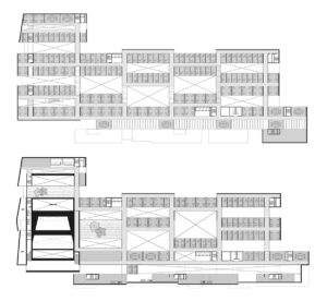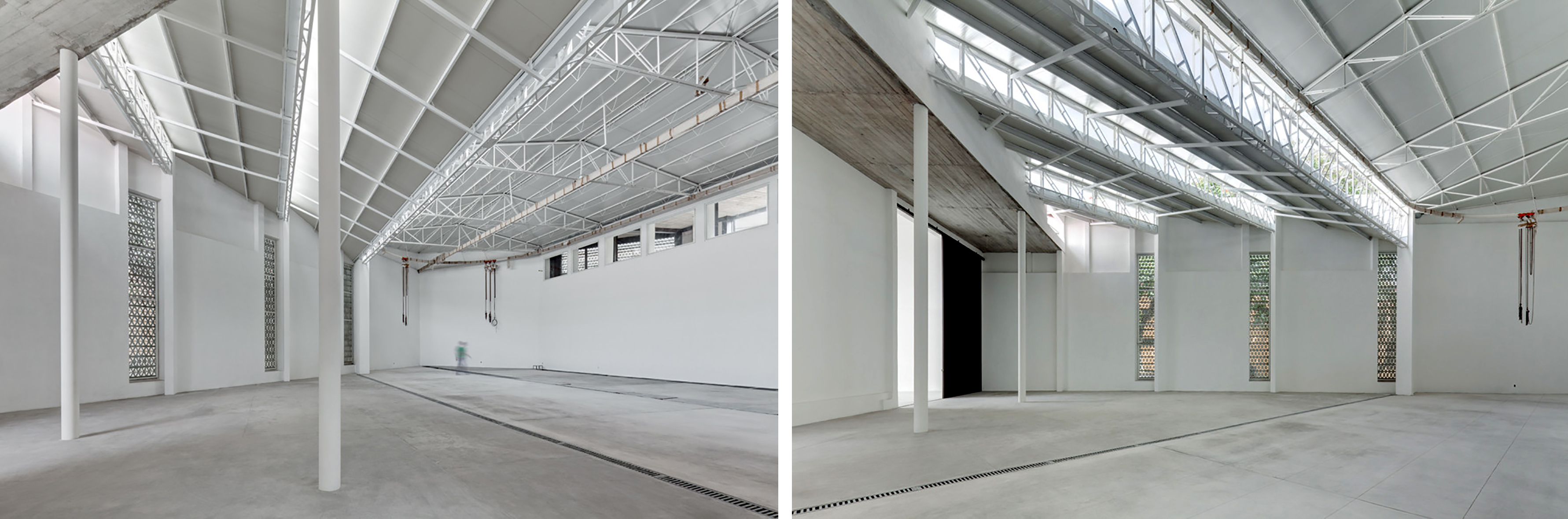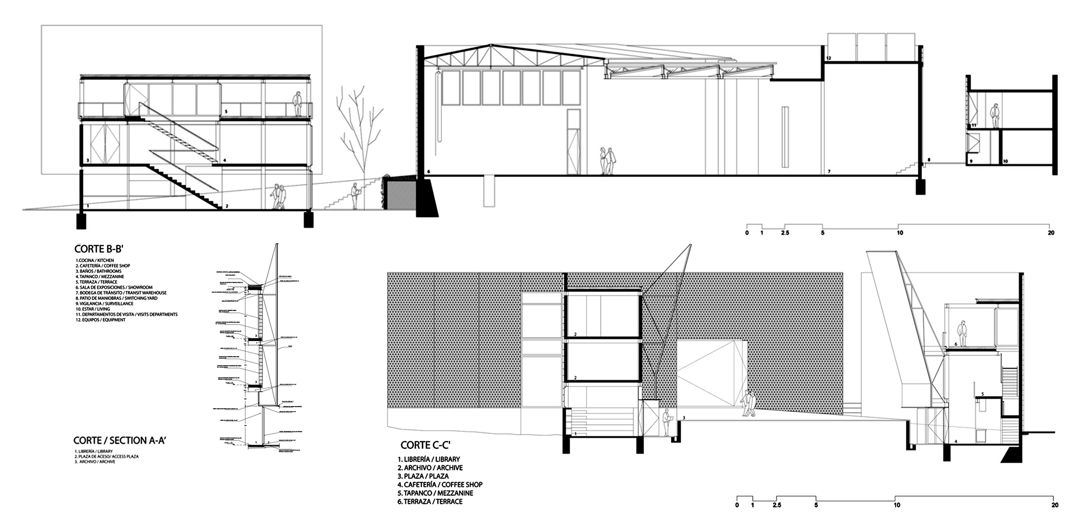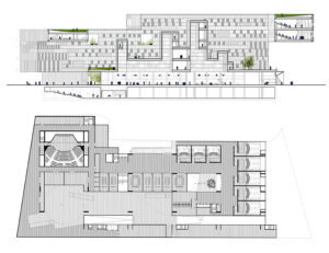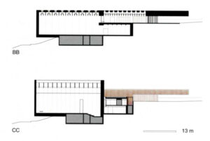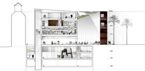 Diversas secciones dispuestas todas la misma escala. Permiten apreciar cómo se filtra la luz y se generan corrientes de aire para mantener el edificio bien temperado. Fuente: archdaily.com.La estructura permite filtrar luz ampliamente.Espacios diáfanos de los Talleres. Su flexibilidad permite actividades diversas. Fuente: archdaily.com.