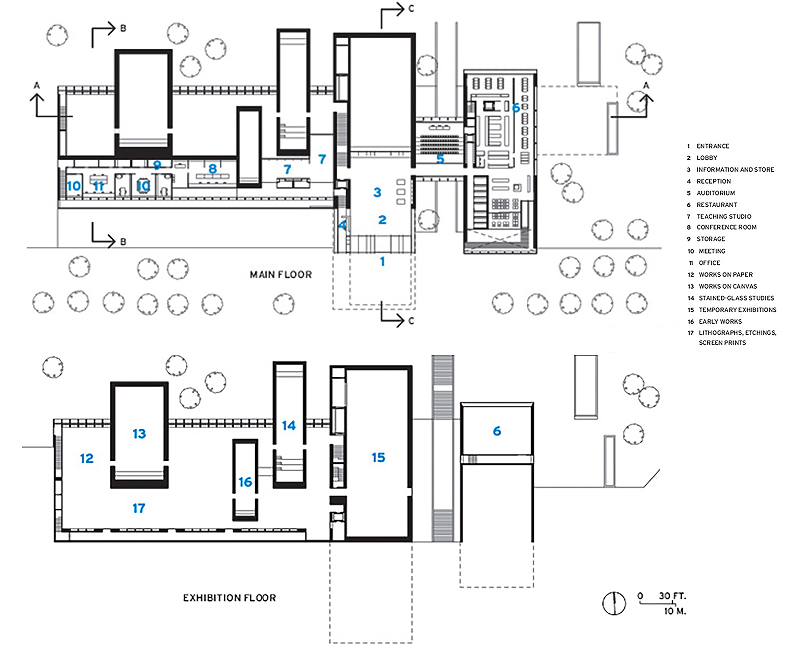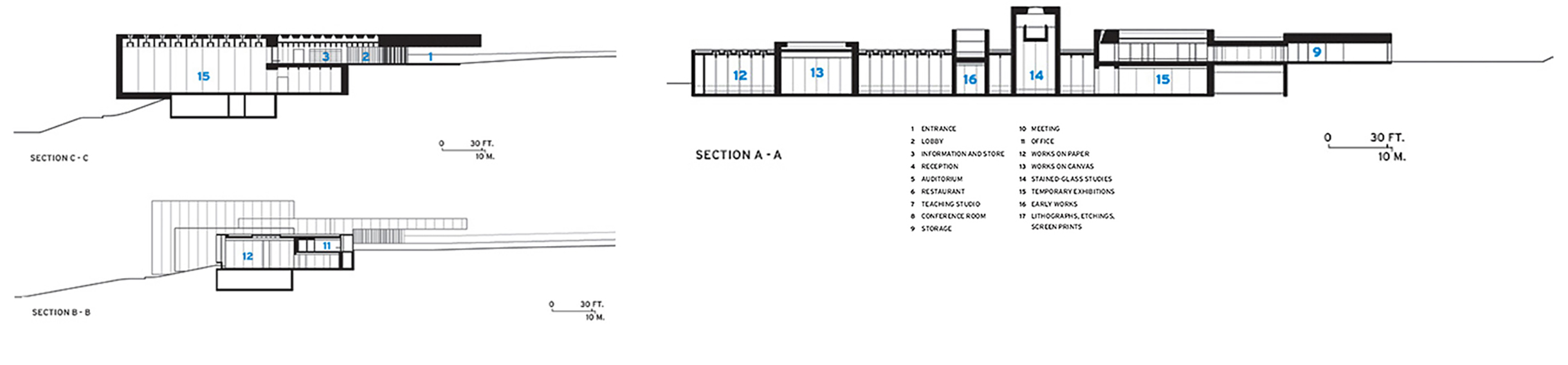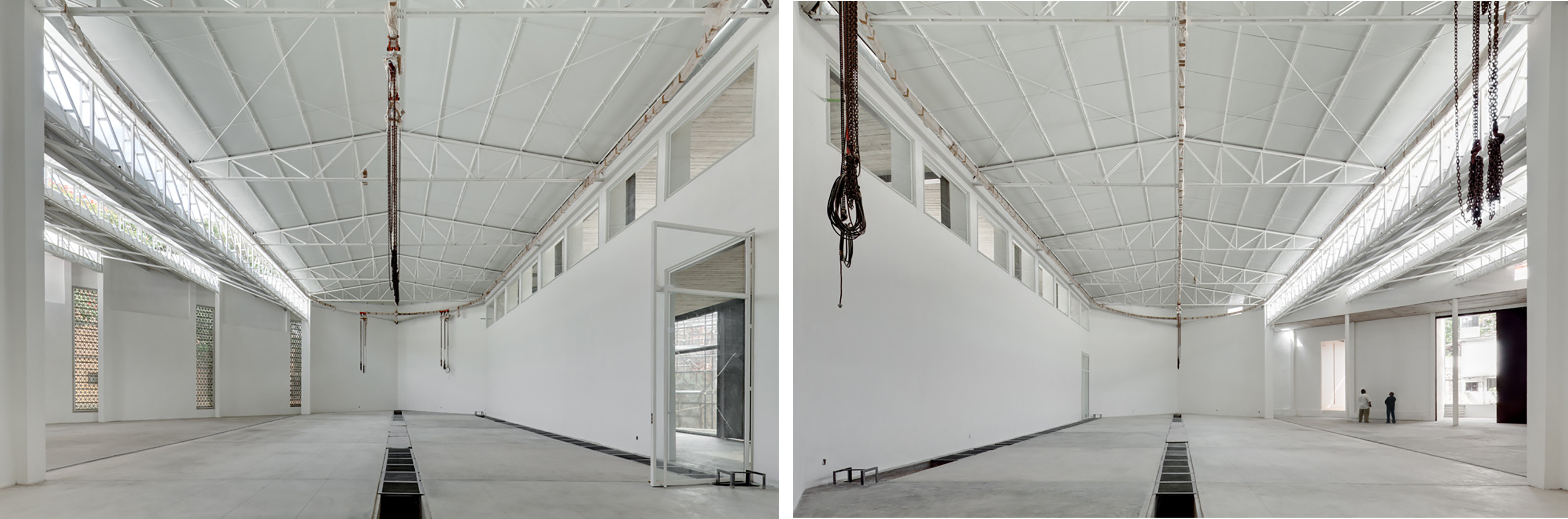 Diversas secciones dispuestas todas la misma escala. Permiten apreciar cómo se filtra la luz y se generan corrientes de aire para mantener el edificio bien temperado. Fuente: archdaily.com.La estructura permite filtrar luz ampliamente.Espacios diáfanos de los Talleres. Su flexibilidad permite actividades diversas. Fuente: archdaily.com.