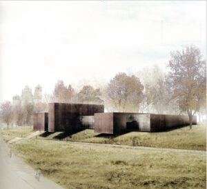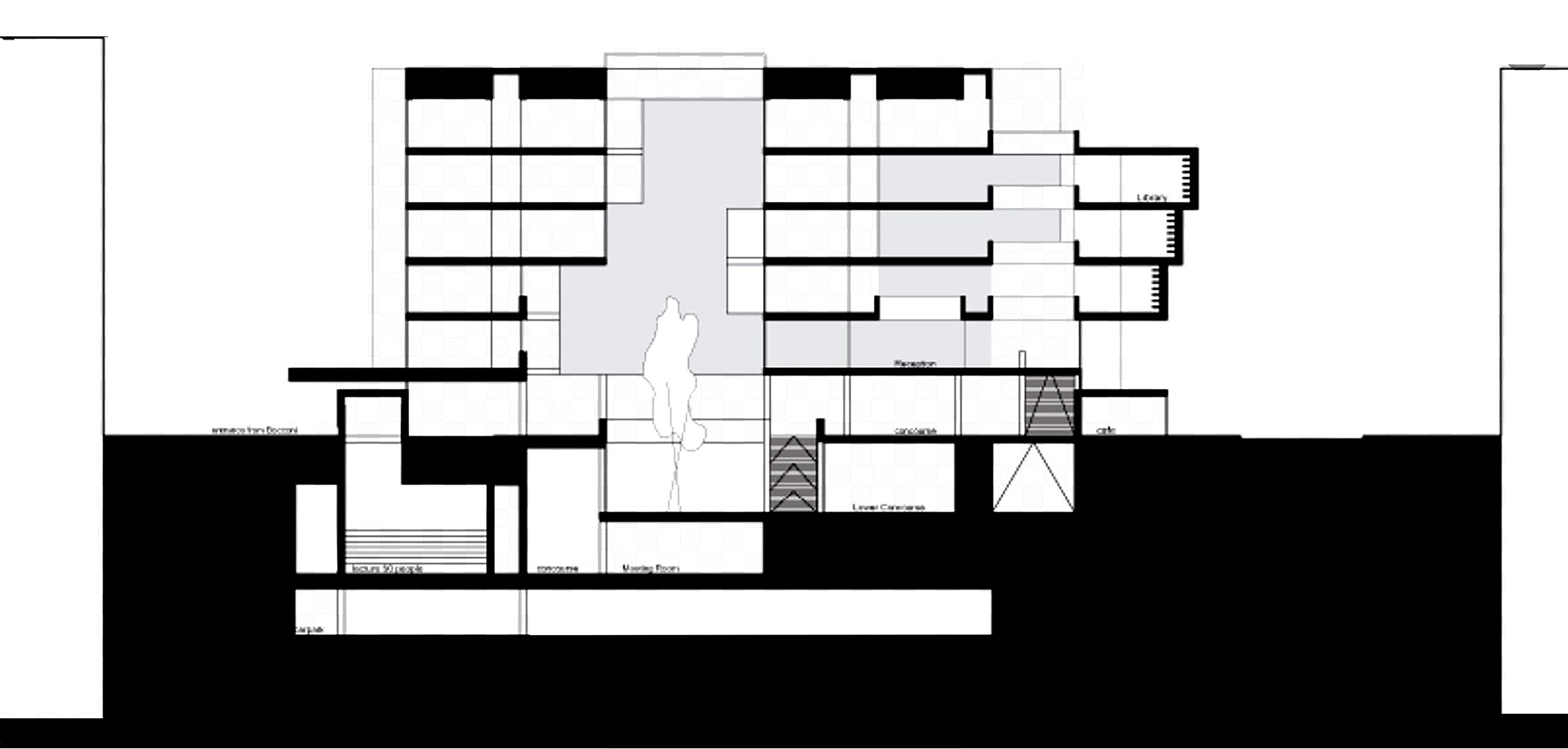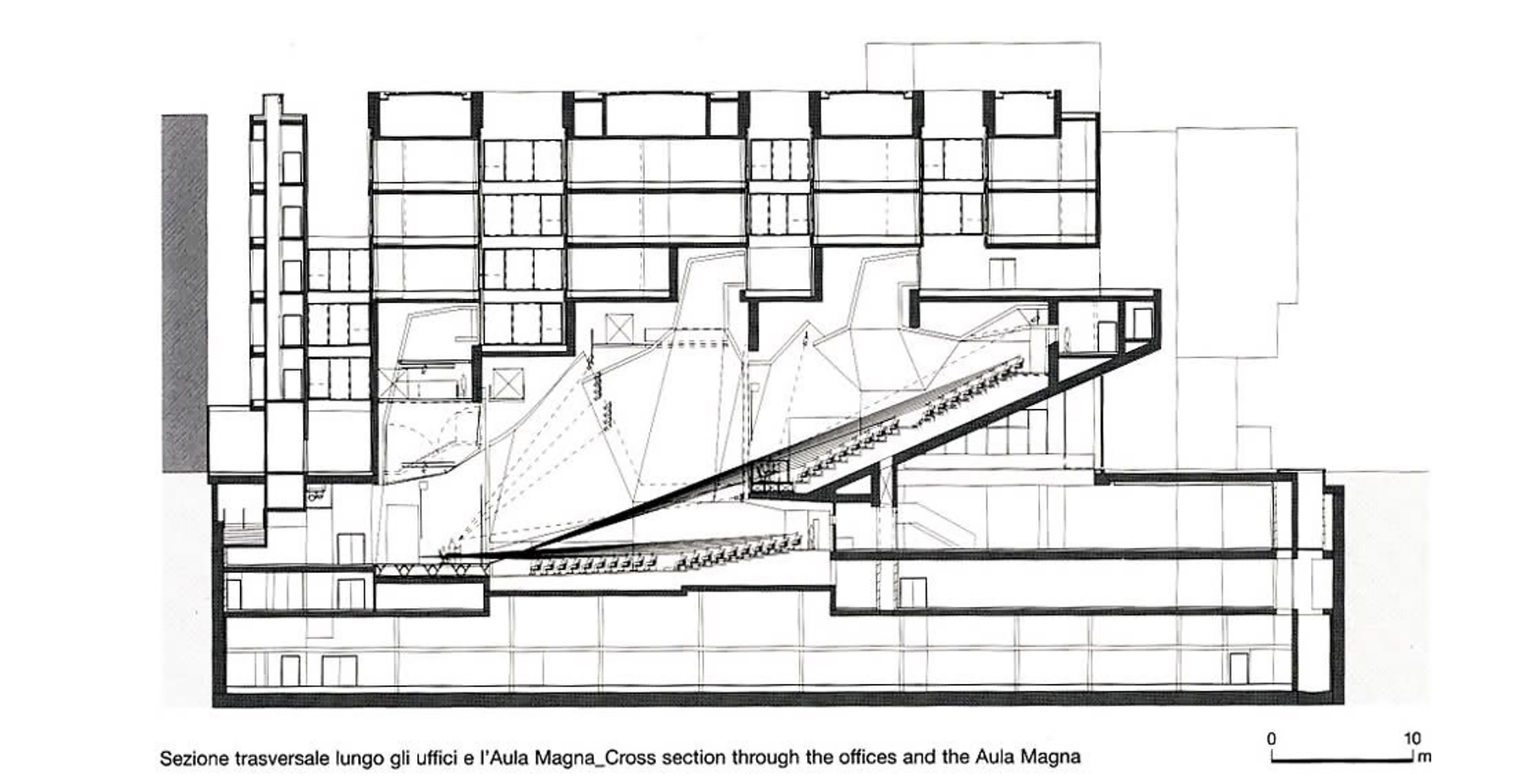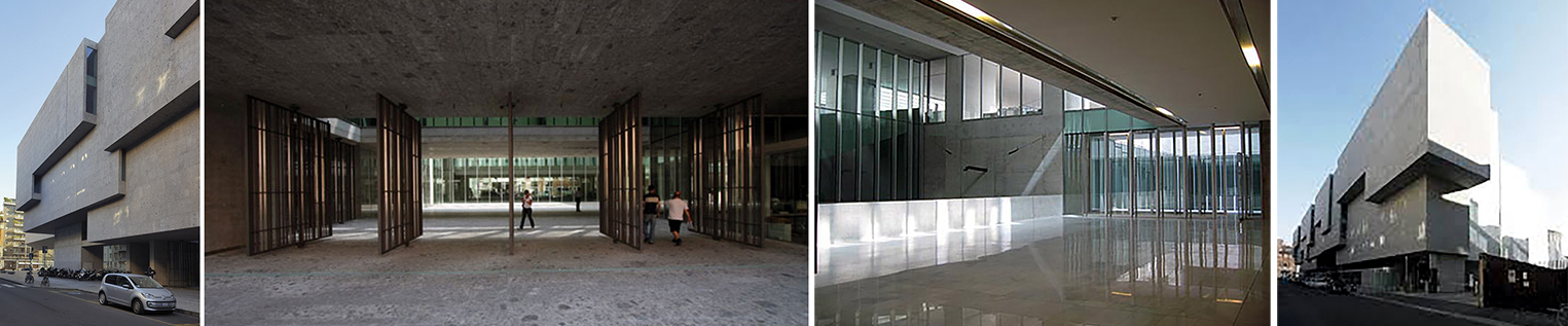La esquina V. Bigny/ Viale G. Röntgen es utilizada para incorporar una arquitectura contundente, con reminiscencias de arquitectura. constructiva y brutaliza. El Aula Magna y la Sala de Exposiciones se disponen junto al acceso principal. Sobre estos espacios una serie de barras recogen ideas de otros maestros, aquí reinterpretaras.