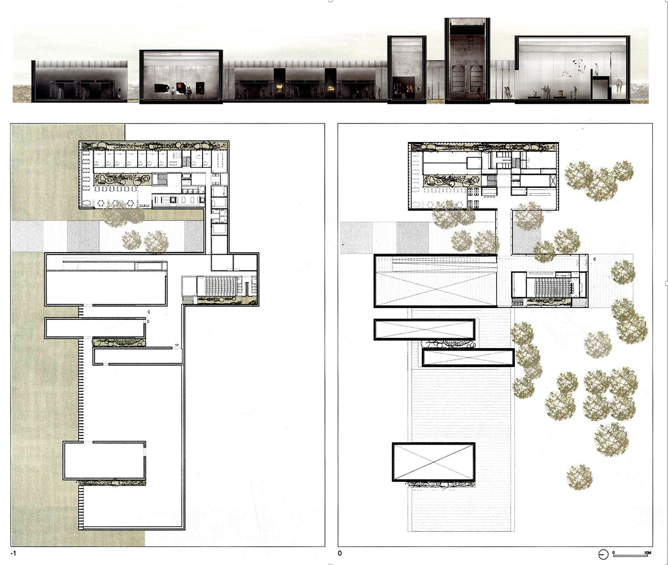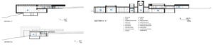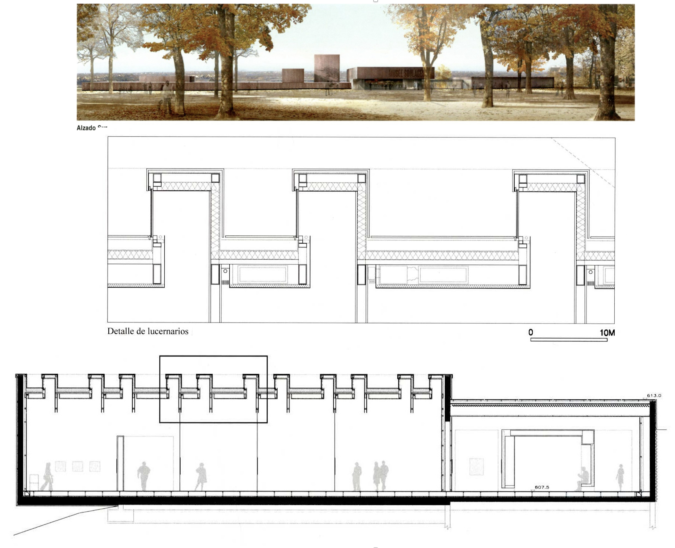La celosía que rodea el nuevo museo-taller aporta una sutileza en el tratamiento de luces y ventilaciones, concediendo privacidad sin necesidad de una separación abrupta. Los matices cambian con las estaciones, también con la hora del día, de manera que se consigue una riqueza espacial de la que se carecería de otro modo. El sistema constructivo se percibe bien en las secciones, donde la luminosidad necesaria de los espacios de taller, el desplazamiento de los murales hacia el acceso principal, incluso una sección detallada del sistema constructivo se nos presenta de una manera clara.