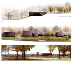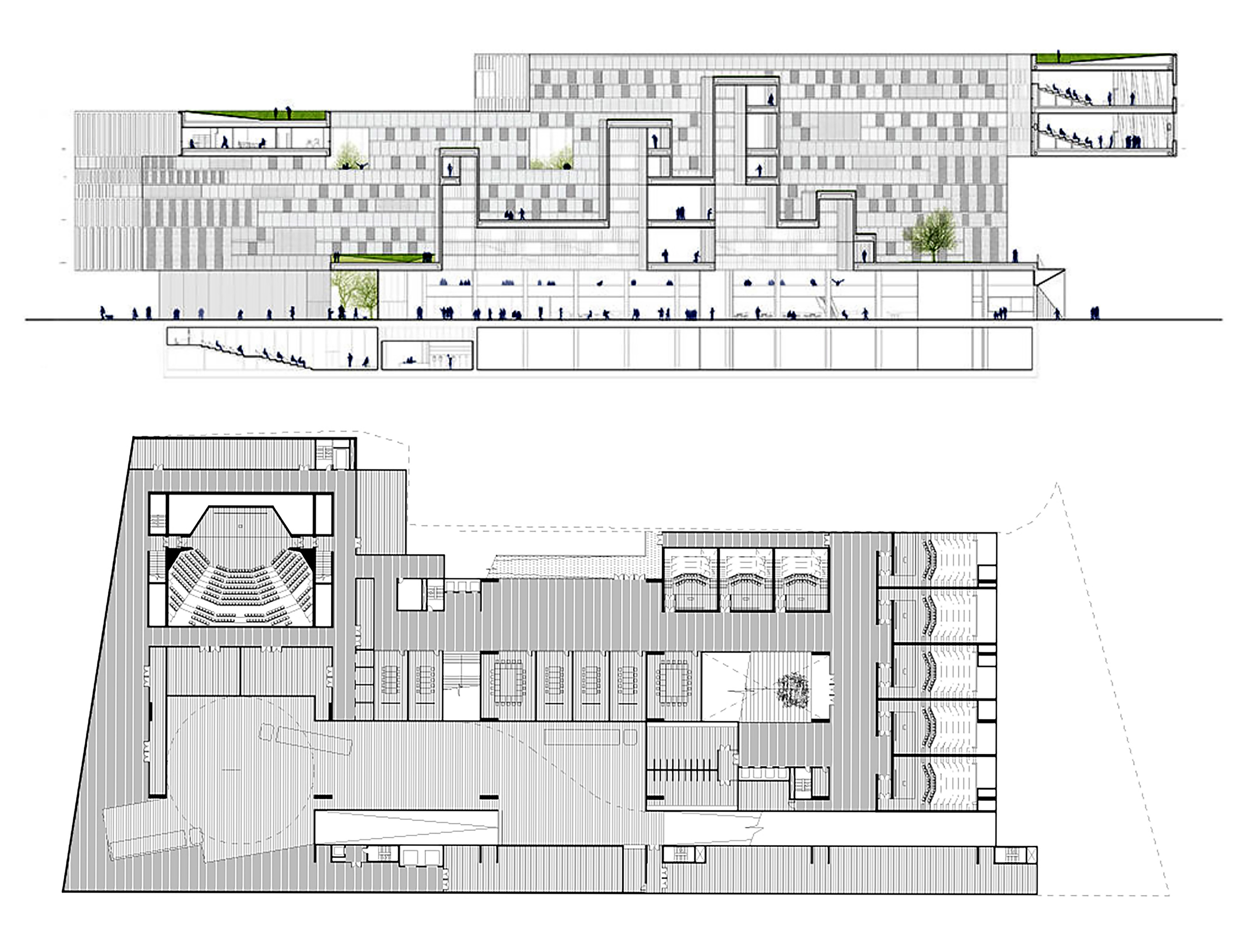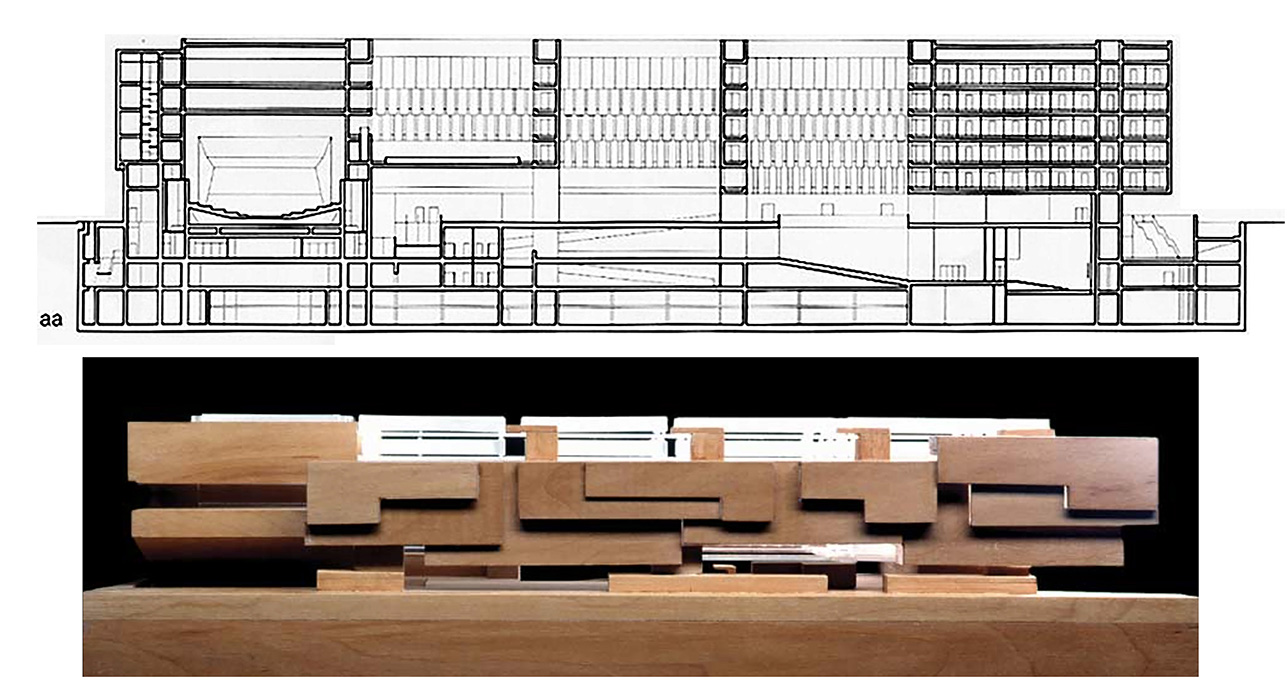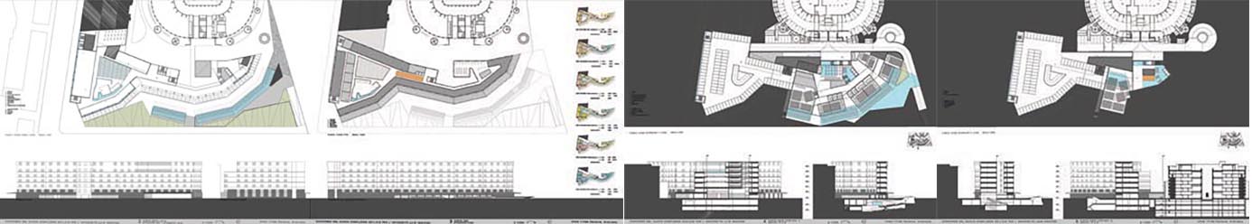 La acomodación al contexto deja ver el propio carácter plural del edificio: a) es perceptible en la agrupación de masas en la sección longitudinal, b) también en la variedad de las secciones transversales, y c) en las articulaciones del edificio con el contexto (coexistencia del volumen de Aula Magna con los pisos superiores, final del edificio en V. Röntgen. Se muestra asimismo la continuidad del vecindario -las propuestas de OMA y la ganadora de SANAA permiten percibir la densidad de ideas contemporáneas en este Campus, que sólo podemos tratar sucintamente-.
