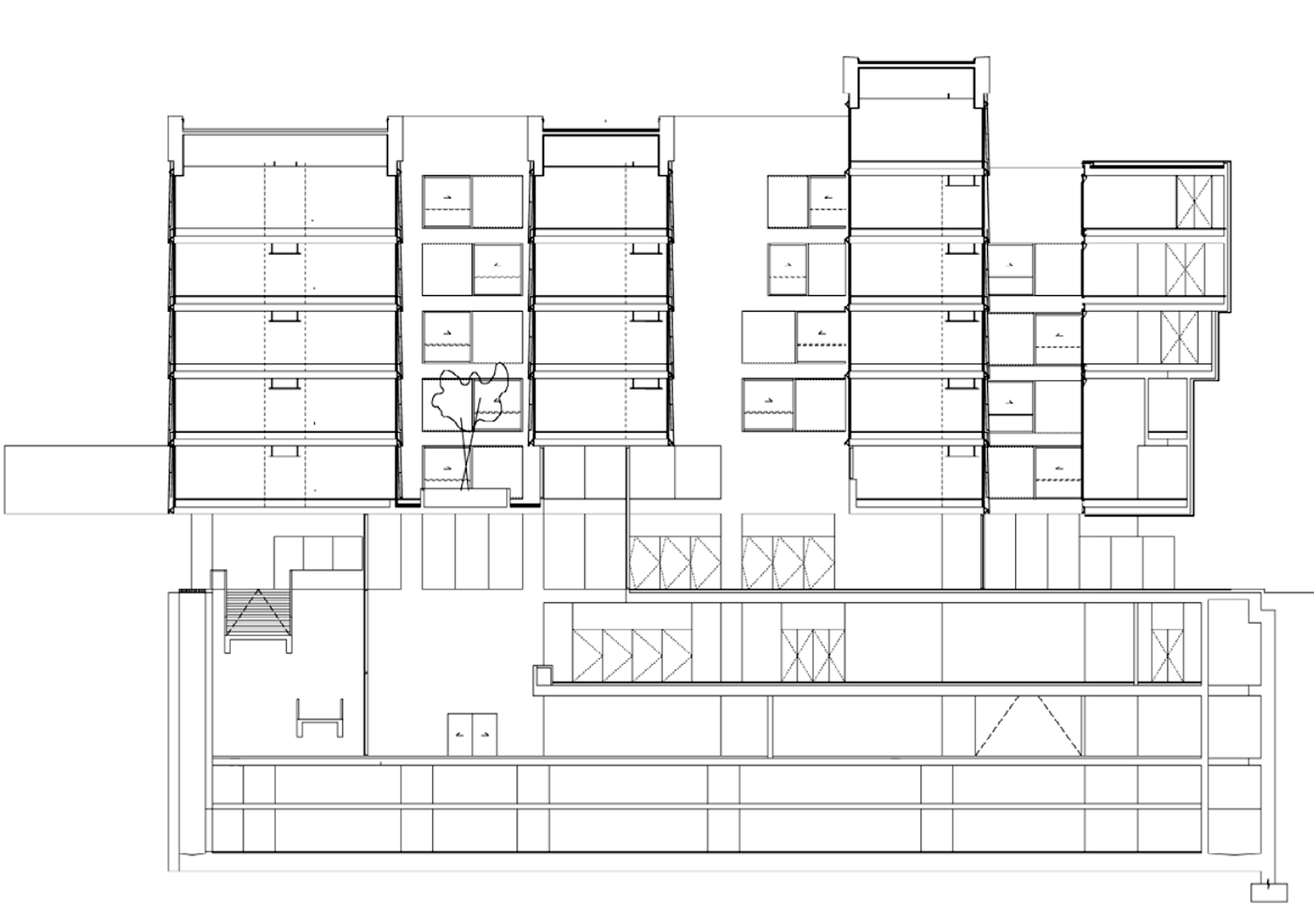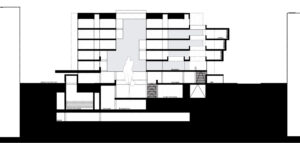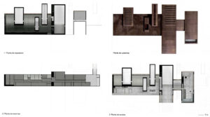 La superposición de plantas manifiesta el difícil diálogo entre una fundada estrategia y la sencillez del resultado final. Es decir, la articulación espacial no sólo se produce en la dirección de las vías circundantes, sino también en altura, con sutilezas como la diferenciación de las ultimas plantas para dotar de atmósfera e iluminación a la vía pública.