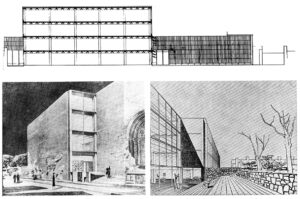La imagen final del edificio cambió durante el desarrollo del proyecto, incluso en el tratamiento del Aula Magna. Nótese el tratamiento de las Secciones.E crecimiento en mensula hacia V. G. Röntgen expresa con claridad cual es el alzado principal.