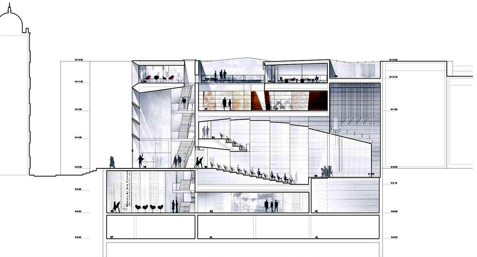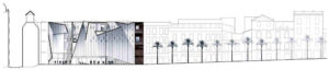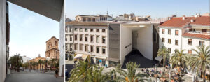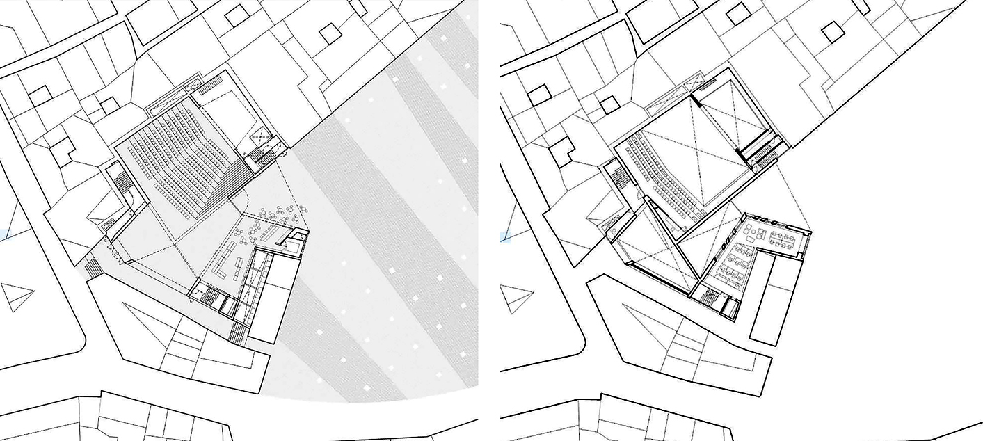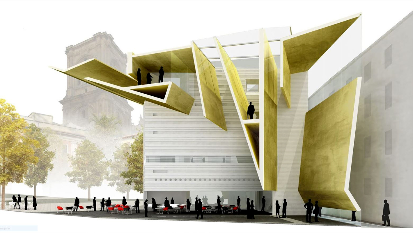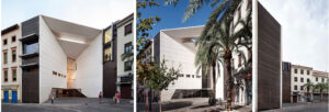 Los límites entre contexto urbano histórico y arquitectura contemporánea se difuminan extendiendo el umbral mediante una dinámica construcción de hormigón visto. El edificio muestra la dificultad de trabajar en los centros históricos, estableciendo una relación natural y continua con el centro histórico de Granada a diferentes escalas de intervención. A nivel del suelo, el edificio se funde con la Plaza de la Romanilla en un espacio continuo, un “Pasaje-Foyer”. Los límites entre lo urbano y lo arquitectónico se desdibujan por un amplio umbral que emerge entre ambos espacios.
