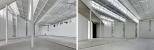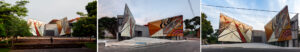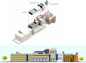 El sencillo giro de los murales permite articular los elementos del acceso, dotando de sentido arquitectónico a la fachada y cambiando la relación previa entre galería y visitante. Tanto el exterior, como el espacio de galería –museográfico y artístico— se desdoblan, generando nuevas relaciones y vínculos espaciales.