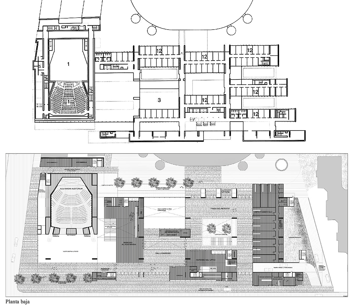 -una amplia perspectiva demanda una potente imagen urbana, continuidad del tejido existente, que abra el edificio a una nueva dimensión pública, donde el volumen del Aula Magna no sea un volumen a ocultar. Presenta entonces la transparencia que toda institución ha de ofrecer para comunicarse con su entorno urbano: el medio es aquí el mensaje.