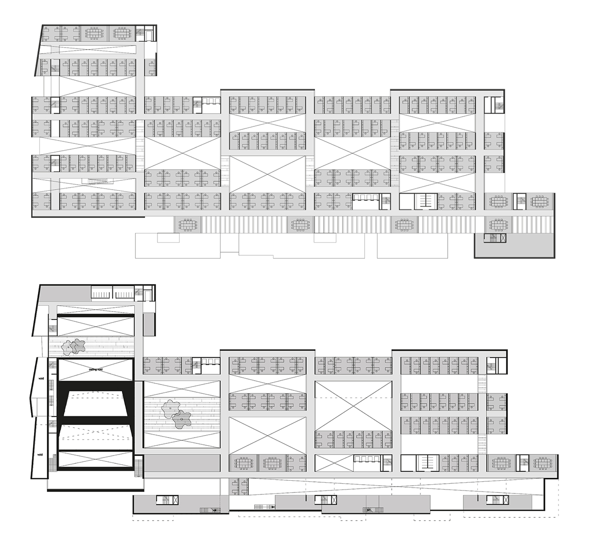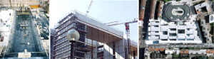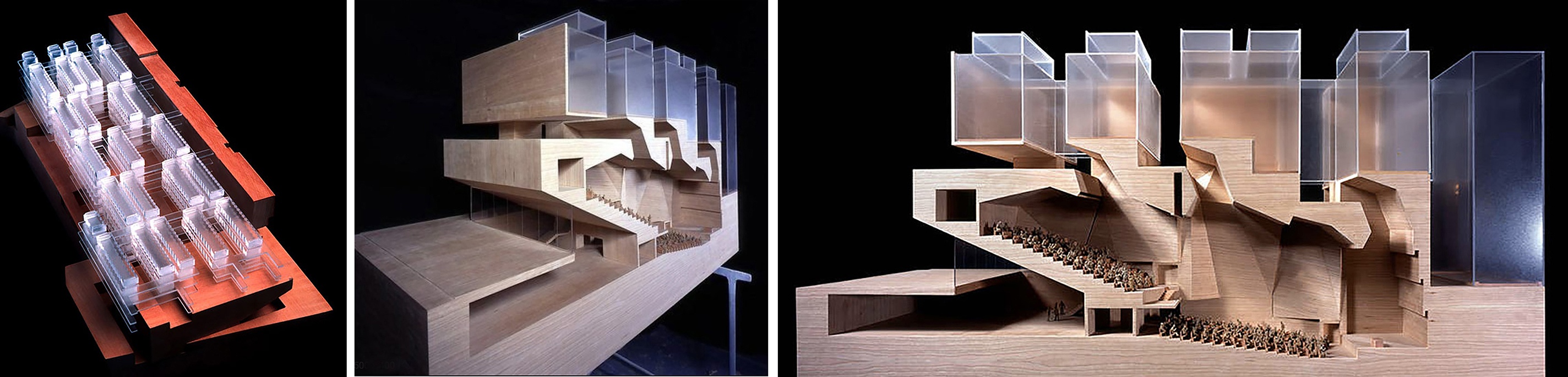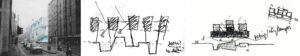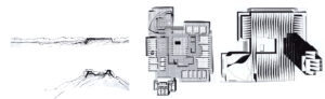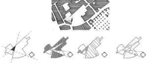 La carencia de referencia/ datum puede resolverse mediante una losa que constituye una plataforma o mediante una losa de transferencia que permita unificar la estructura en altura. Soluciones utilizadas por Jörn Utzon, que permiten introducir una modulación y ajuste de tipologías.En diferentes alturas el edificio se ajusta a la situación estructural.Maquetas de concurso (fuente Grafton Archs, Ros Kavanagh).Diferentes modos de gráfica permiten representar conceptos distintos; tal es el caso de los elementos interticiales entre cada área de bloques, o los espacios permeables entre patios o entre el edificio y su entorno. (Fuente Grafton Archs., Ros Kavanagh)