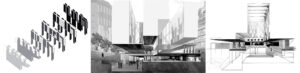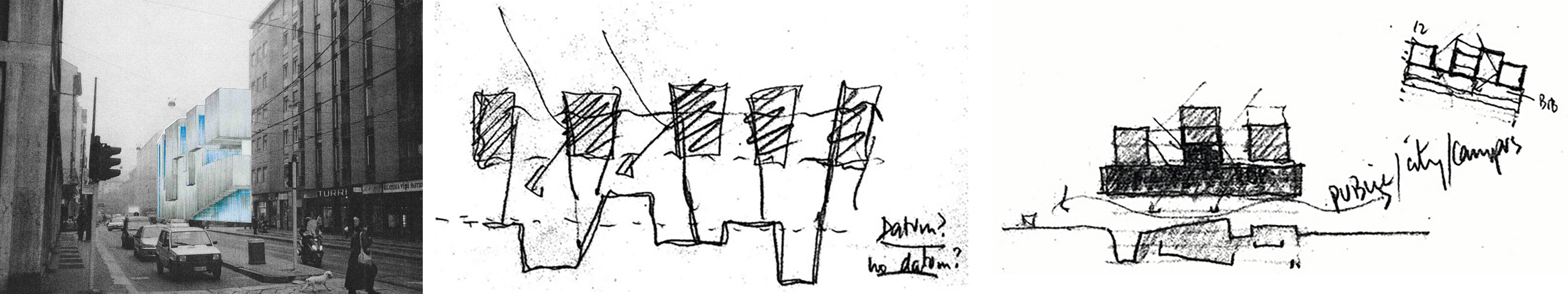 Primeros esbozos de Grafton para la U. L. Bocconi. La ausencia de una referencia es percibida junto a una situación pública, urbana, del campus.