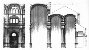Naves de la Catedral. Dibujo de Dehio.Secciones iterativas, desde la fotografía de Laurent, cuando existía el coro, la de Garzón y una reciente de Iago Mehring, de la fachada. Comparando con la sección dibujada por Dehio ( más abajo) podemos entender cómo esta sofisticación de la dimensión vertical se va trasladando. La torre única, construida así por problemas de cimentación en su simétrica, se convierte en un hito adicional en la zona.