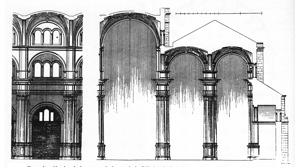 Alzado principal y sección longitudinal (fuente Grafton Archs.).