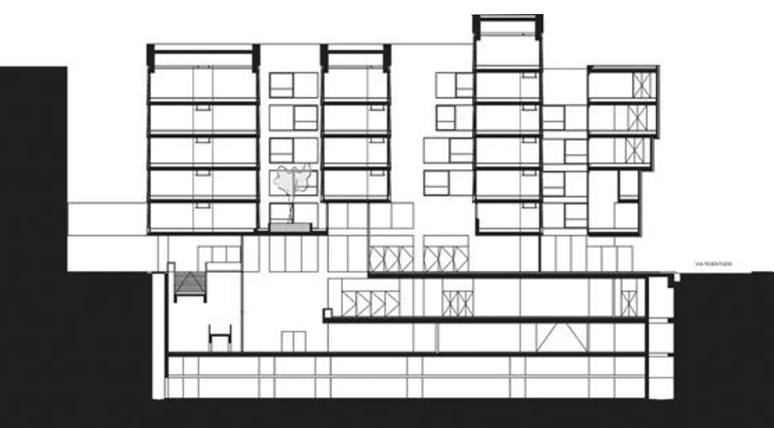 cómo se enclava en el tejido urbano existente, el diálogo del sistema constructivo con el espacio circundante (monumental en la esquina V. Bligny, V. Röntgen; continuidad tipológica en el final de V. Röntgen;…), y