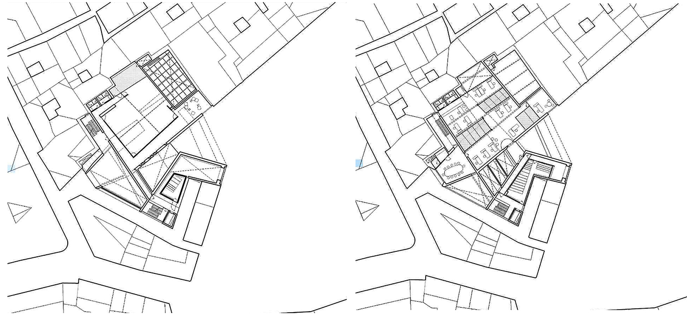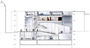 El edificio es una inserción urbana exitosa desde su concepto estructural. Una búsqueda para construir una planta abierta, donde todos los elementos de apoyo permanecen alrededor del perímetro de la parcela. La estructura y la geometría van de la mano, y el hormigón no sólo se utiliza como elemento de apoyo, sino como el principal material de acabado. La integración de este material casi industrial en un centro histórico requirió un tratamiento especial con diferentes texturas y patrones para lograr el efecto de una piedra artificial, de mayor calidez y diálogo con el entorno.