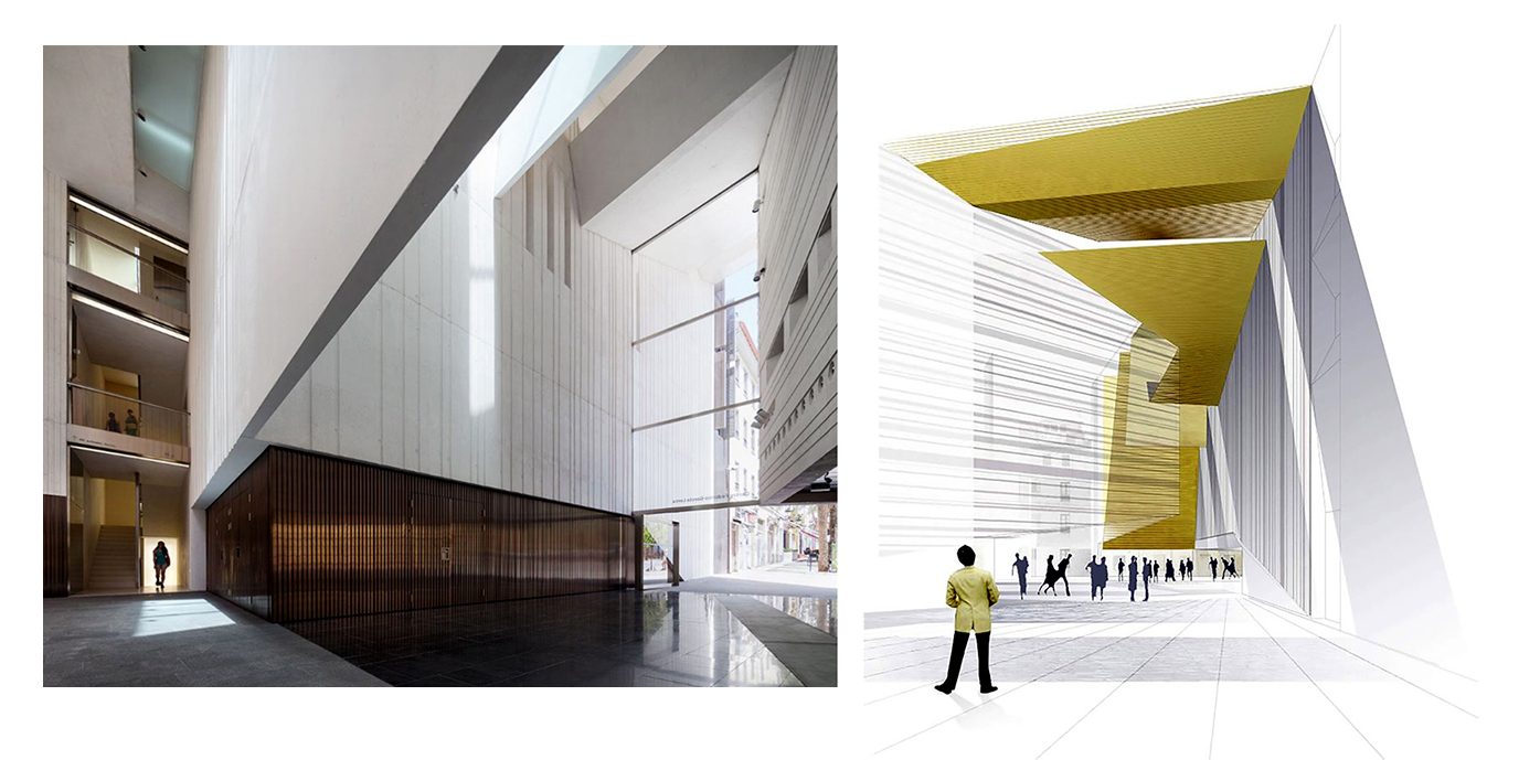 La propuesta geométrica evita construir un volumen, de modo que la fuerza de su imagen deriva de esculpir un vacío, el umbral que conecta el espacio urbano con el edificio. De este modo el acceso principal se convierte en una gran entrada donde la luz y la sombra son la principal interfaz para un espacio tridimensional lleno de relaciones espaciales.