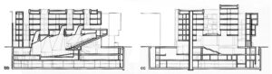 use long dimension/ usad la dimensión larga; twin blocks/ bloquesgemelos; transfer beam, see Salk/ viga de transferencia, ver Salk; datum?, no datum/ referencia, no hay referencia; mountains, valleys/ montañas y valles; beams + ducts/ forjados+ conductos; public space/espacio público; ramped/ en rampa; cars+ peds/ vehículos y peatones/ dropped courts to rew to give light + ventilación to conference level/ dejar patios hacia la parte trasera para dar luz y ventilación al nivel del Aula.