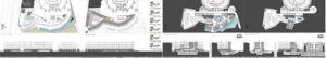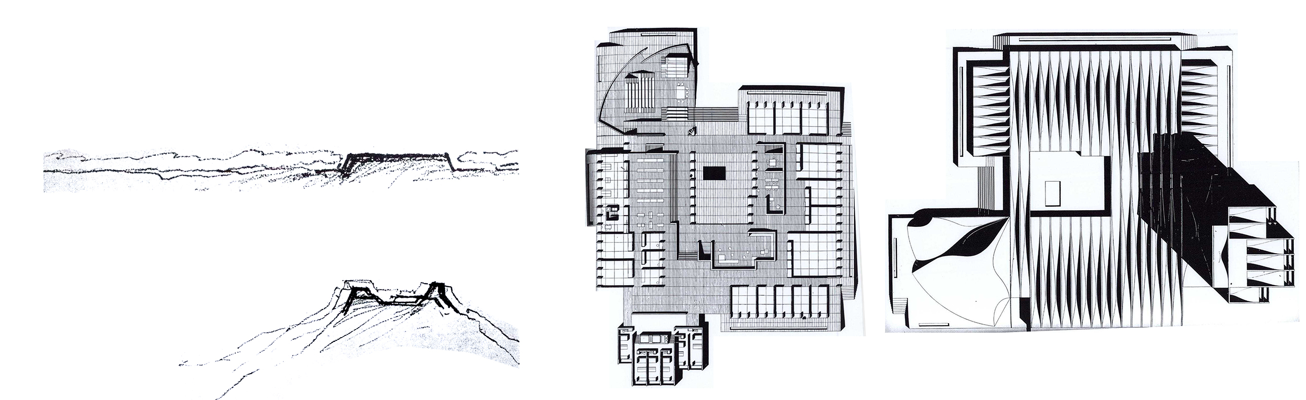 Fase II. Desde fuentes claras, estudiamos la planta de pre-existencias (cubiertas y planta general), la propuesta de De Carlo, y las secciones transversales. Redibujar la cubierta es una oportunidad para captar un orden tangible, y los intercambios lógicos que aparecieron en sucesivas generaciones. Más adelante explicaremos la morfología en detalle.