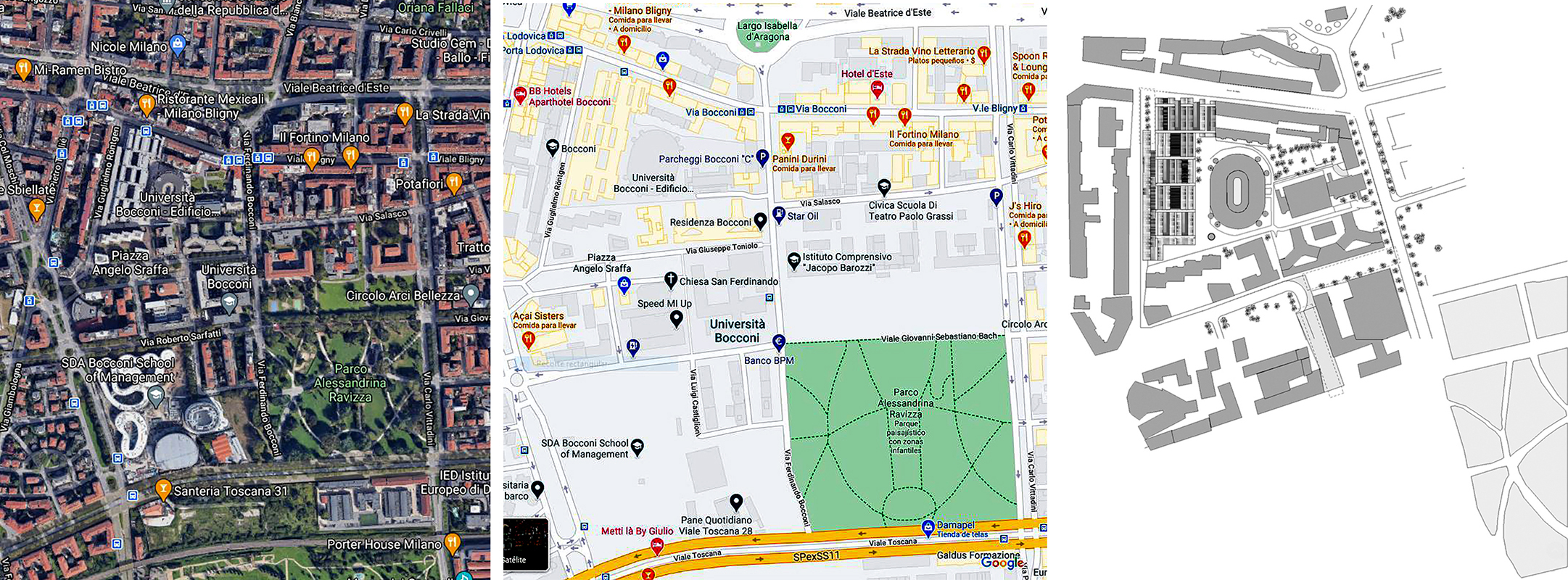 Area de los concursos para la Università L. Bocconi, entre Viale Bligny y Via G. Röntgen, complementada por otra área junto a Via R. Sarfatti, próxima al Parque A. Ravizza. En gris la intervención de Grafton Archs.
