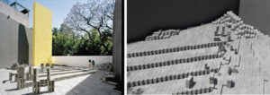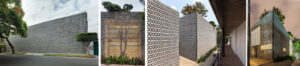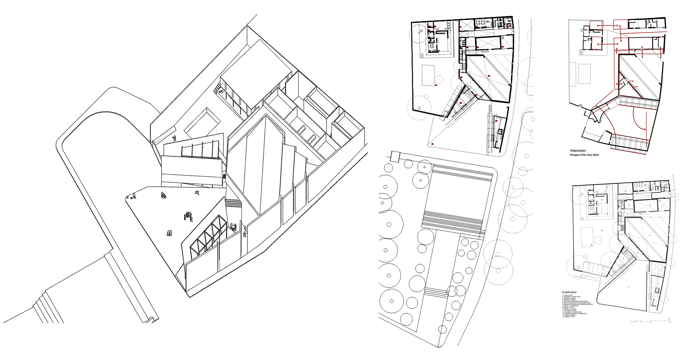 Axonometría del proyecto, junto a secuencia de plantas, donde puede contraponerse con claridad la propuesta realizada junto al espacio público, y la transformación de la casa con patio original, abierto mediante el giro de los murales preexistentes. La lectura de la llegada y de la visión retrospectiva, al girar la mirada al trayecto de llegada, hacen coexistir el recorrido de acceso y la reconsideración de la experiencia del movimiento. Fuente: archdaily.com.Murales girados acogen a la entrada como dos brazos abiertos, estableciendo una continuidad con el espacio publico. Fuente: archdaily.com.Los murales situados en el exterior quedan soportados por pequeñas construcciones que dan continuidad constructiva y contenido de programa al edificio existente. Fuente: archdaily.com.
