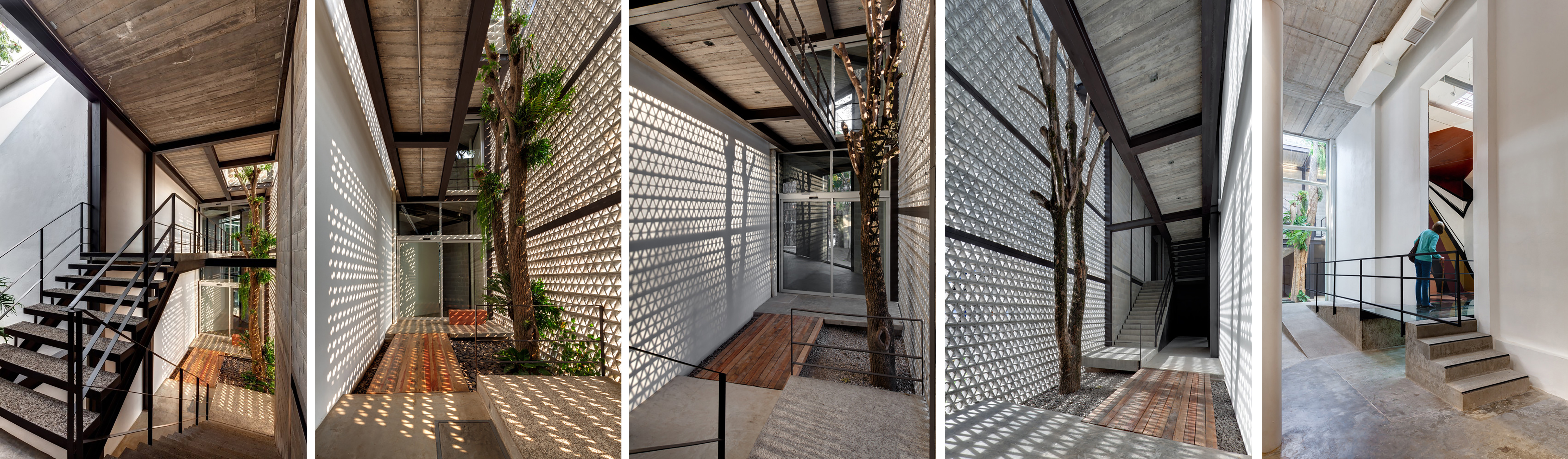 La antigua construcción recibe una apariencia de novedad al ser rodeada por una celosía a través de la cual se filtran las aberturas y aportando imágenes cambiantes, desde la opacidad a la transparencia. Fuente: archdaily.com.Las luces filtradas for la celosía perimetral y los pasillos llenan de claridad los espacios, confiriendo una mayor amplitud.