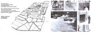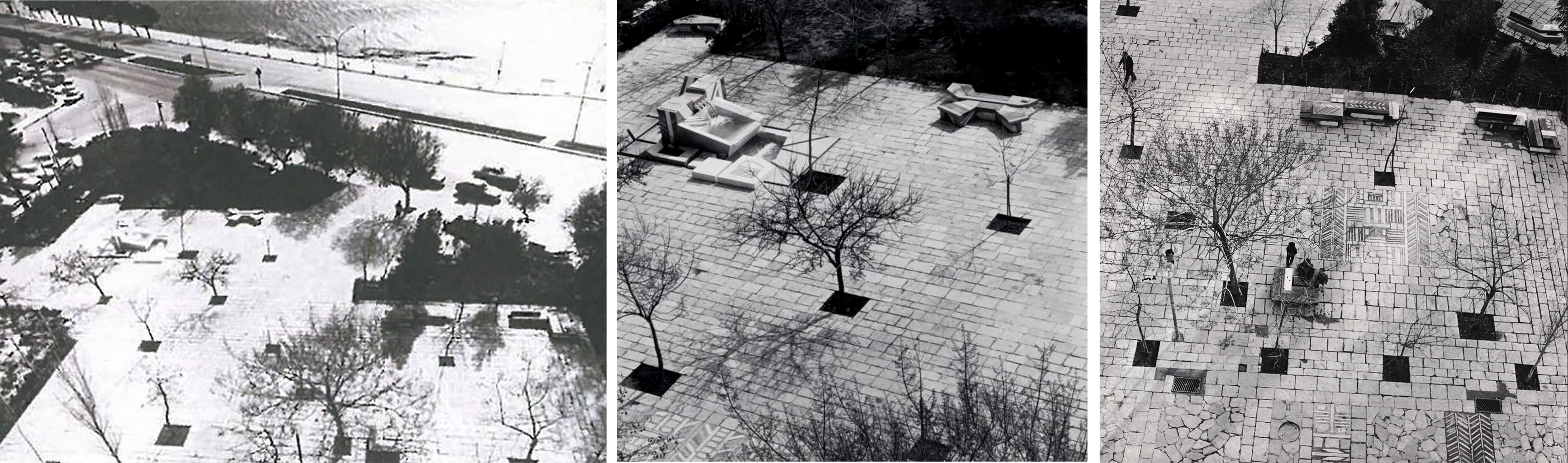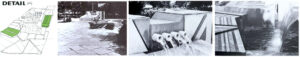 – Describir los ámbitos de este lugar. Nótese que los diversos grupos de mobiliario urbano-esculturas- fuentes, o como podamos llamarlos, delimitan areas, abriendo y cerrando dominios.