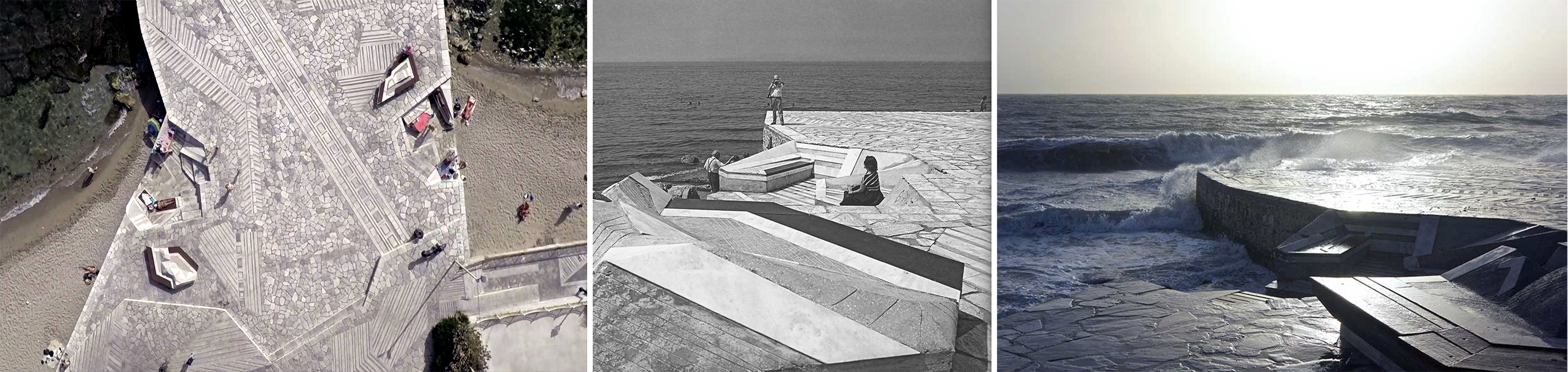 Fuimos conscientes de inmediato de la calidad y de la belleza de este lugar que contrastaba fuertemente con lo azaroso de las numerosas construcciones de infraestructuras que habíamos visto dispersas por toda la costa. Sin embargo, también estábamos desconcertados, y empezamos a hablar sobre lo que teníamos ante nuestros ojos. ¿era esto arquitectura?, ¿una escultura?, ¿una pieza de infraestructura?, ¿una escenografía? ¿Era un escenario para un teatro, un mirador, un malecón, un pedestal, una fortificación, un salón al aire libre? Era imposible definir el tipo de estructura, e incluso nos costó describir su tamaño. Sin embargo, sentimos que aquella construcción se relacionaba de una manera muy específica con nuestros cuerpos, que producía un estado de atención intensificada hacia el aquí y e ahora, y eso agudizaba nuestra percepción de los alrededores.